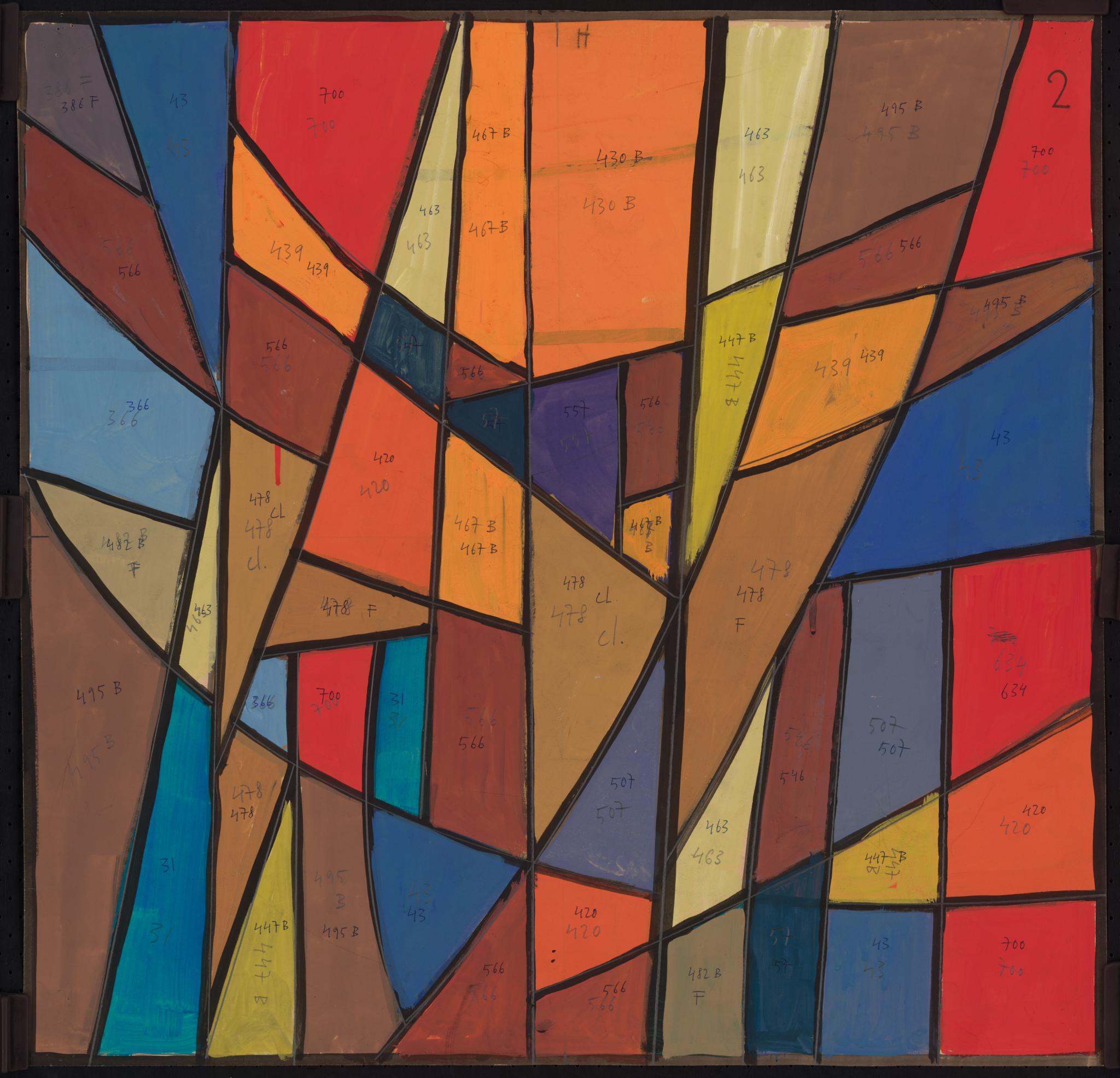 Ce carton de Bodjol est le projet définitif pour l'une des vingt verrières (GE_62.04) commandées en 1983 à l’artiste par Jean-Jacques Buard, alors pasteur de la paroisse protestante de Cointrin-Avanchet, pour orner les dix paires de fenêtres carrées du Centre communautaire oecuménique d'Avanchet. Celui-ci a été vendu en 2016 par les églises protestante et catholique à l’église pentecôtiste, qui a déposé l’ensemble des verrières, sauvé in extremis par l’Association pour la Promotion de l’Art Sacré (APAS) (Buard, 2018). La même année, six verrières ont été offertes par l’APAS à la chapelle des Crêts au Grand-Saconnex, deux en 2017 au Vitromusée Romont, et cinq à la paroisse protestante d’Anières en 2018, dont celle correspondant à ce carton. Sept verrières sont encore propriété de l'APAS et pourraient être offertes à d'autres paroisses qui souhaiteraient orner leur sanctuaire d'une ou plusieurs de ces verrières.