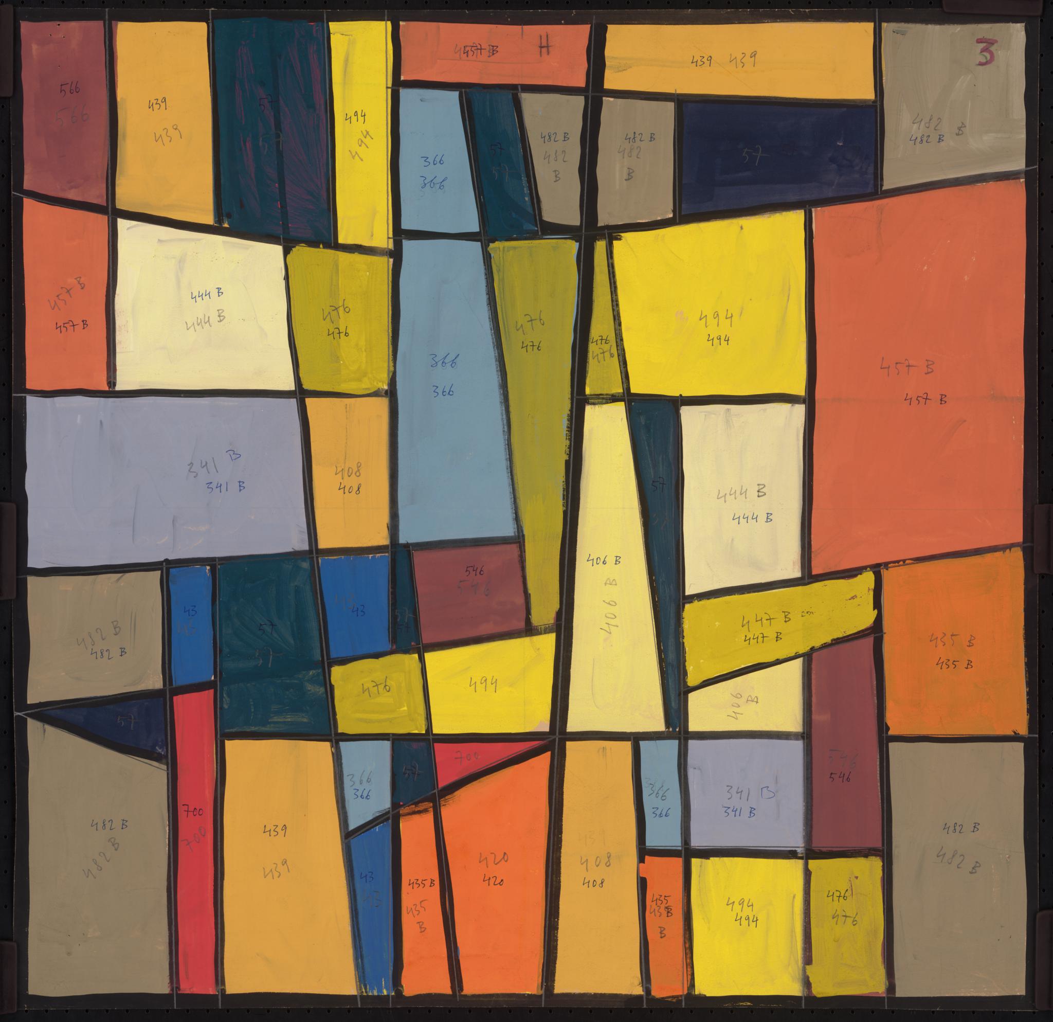 Ce carton de Bodjol est le projet définitif pour l'une des vingt verrières (GE_62.03) commandées en 1983 à l’artiste par Jean-Jacques Buard, alors pasteur de la paroisse protestante de Cointrin-Avanchet, pour orner les dix paires de fenêtres carrées du Centre communautaire oecuménique d'Avanchet. Celui-ci a été vendu en 2016 par les églises protestante et catholique à l’église pentecôtiste, qui a déposé l’ensemble des verrières, sauvé in extremis par l’Association pour la Promotion de l’Art Sacré (APAS) (Buard, 2018). La même année, six verrières ont été offertes par l’APAS à la chapelle des Crêts au Grand-Saconnex, deux en 2017 au Vitromusée Romont et cinq à la paroisse protestante d’Anières en 2018, dont celle correspondant à ce carton. Sept verrières sont encore propriété de l'APAS et pourraient être offertes à d'autres paroisses qui souhaiteraient orner leur sanctuaire d'une ou plusieurs de ces verrières.
