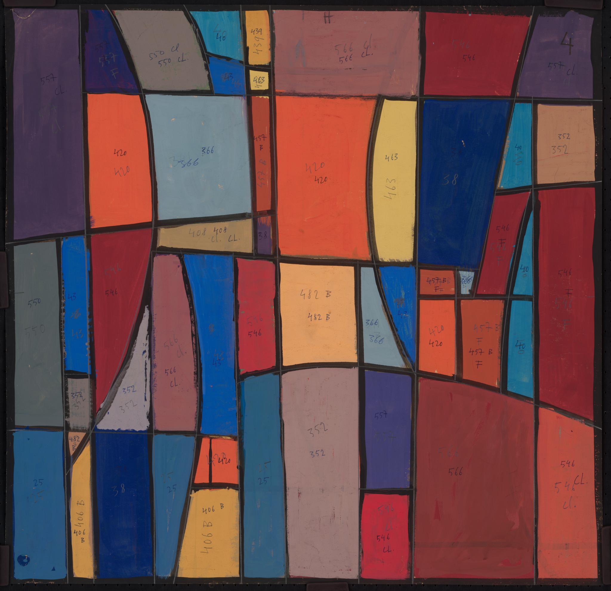 Ce carton de Bodjol est le projet définitif pour l'une des vingt verrières (VMR_828) commandées en 1983 à l’artiste par Jean-Jacques Buard, alors pasteur de la paroisse protestante de Cointrin-Avanchet, pour orner les dix paires de fenêtres carrées du Centre communautaire oecuménique d'Avanchet. Celui-ci a été vendu en 2016 par les églises protestante et catholique à l’église pentecôtiste, qui a déposé l’ensemble des verrières, sauvé in extremis par l’Association pour la Promotion de l’Art Sacré (APAS) (Buard, 2018). La même année, six verrières ont été offertes par l’APAS à la chapelle des Crêts au Grand-Saconnex, deux en 2017 au Vitromusée Romont, dont celle correspondant à ce carton, et cinq à la paroisse protestante d’Anières en 2018. Sept verrières sont encore propriété de l'APAS et pourraient être offertes à d'autres paroisses qui souhaiteraient orner leur sanctuaire d'une ou plusieurs de ces verrières.