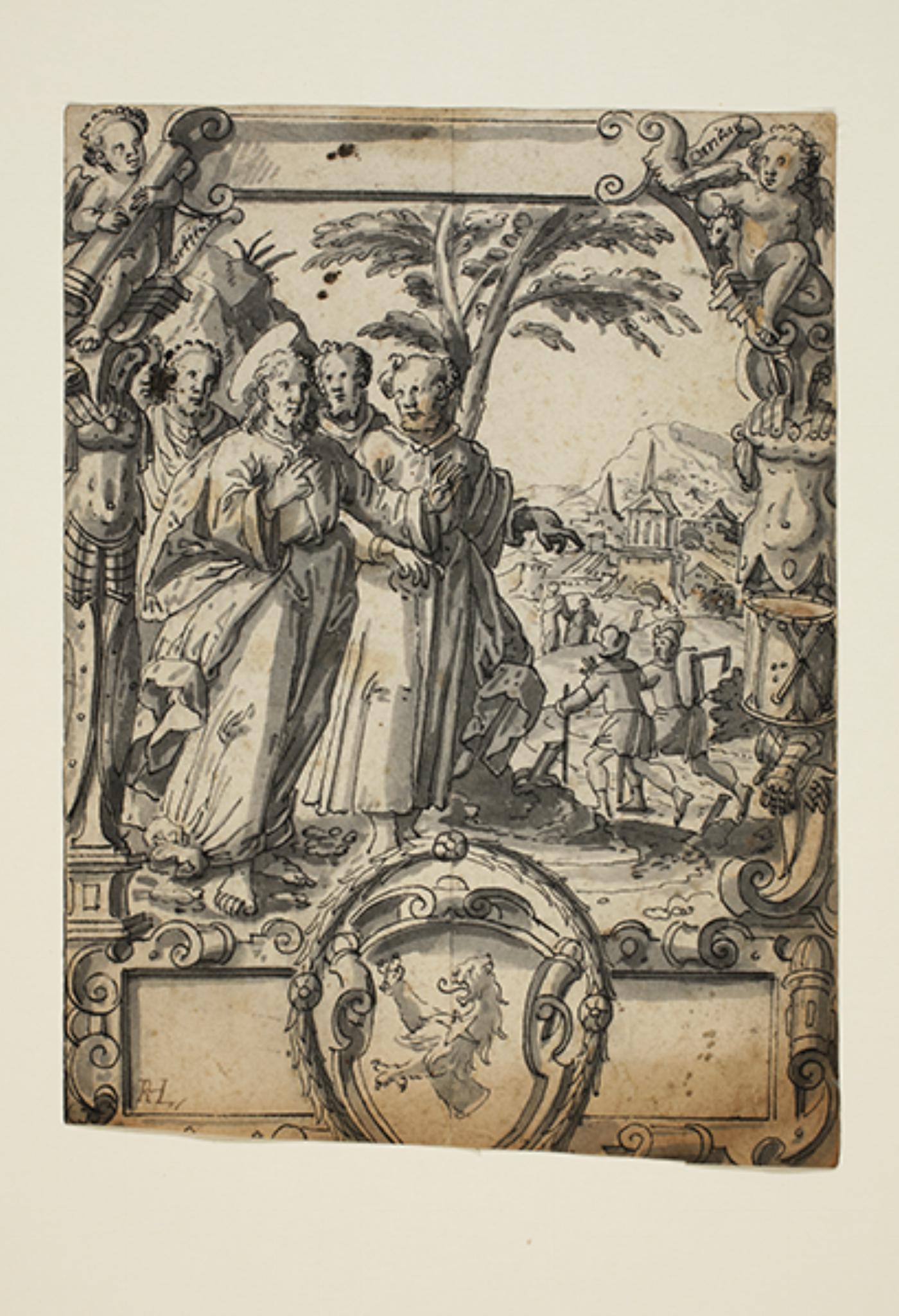 Von links tritt Christus im Gefolge seiner Jünger ins Bild. Rechts von Christus zeigt Petrus auf Bauern, die sich auf dem Weg in die im Hintergrund erscheinende Stadt befinden. Nach Hasler könnte es sich um die neutestamentliche Szene der Aussendung der Jünger (Mt 10, 5–15; Mk 6, 7–13; Lk 9, 1–6) handeln (Hasler 1996/1997, 1. Bd. S. 261). Der reich geschmückte Rahmen zeigt rechts und links unterschiedliche Trophäen. Oben wird der Bogen durch eine leere Inschriftenkartusche gebildet. In den Zwickeln sitzen zwei Engelknaben als Tugendallegorien der Stärke mit der Säule und der christlichen Liebe mit dem Lamm. Unten wird der Riss mit einer grossen Rollwerkkartusche abgeschlossen auf der zentral das oval umkränzte Wappen Grebel aufgesetzt ist.
