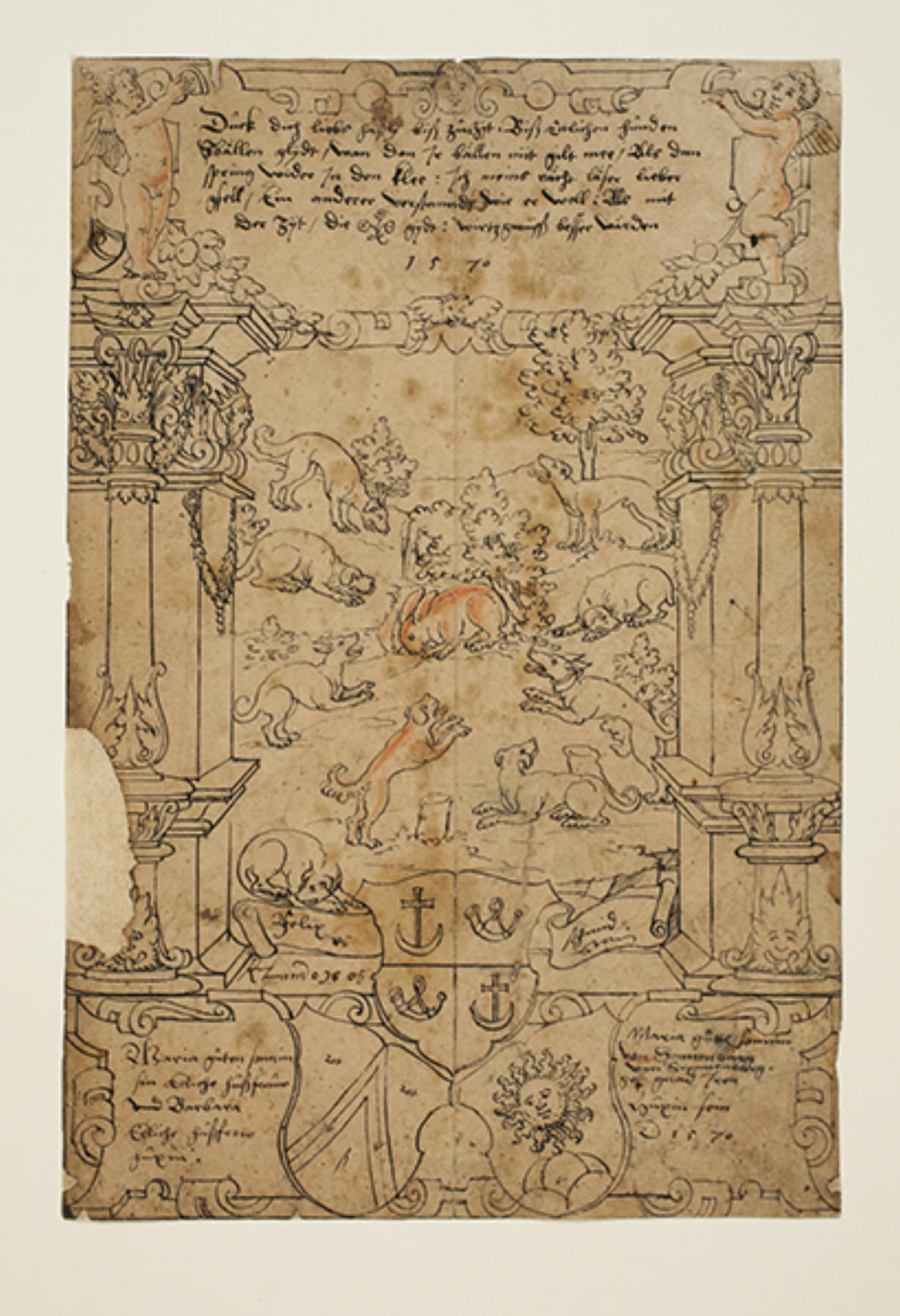 Riss zu einer Allianzwappenscheibe für Felix Schmid, Maria Gutenson von Sonnenberg und Barbara Hux mit der Darstellung des von Hunden gejagten Hasen