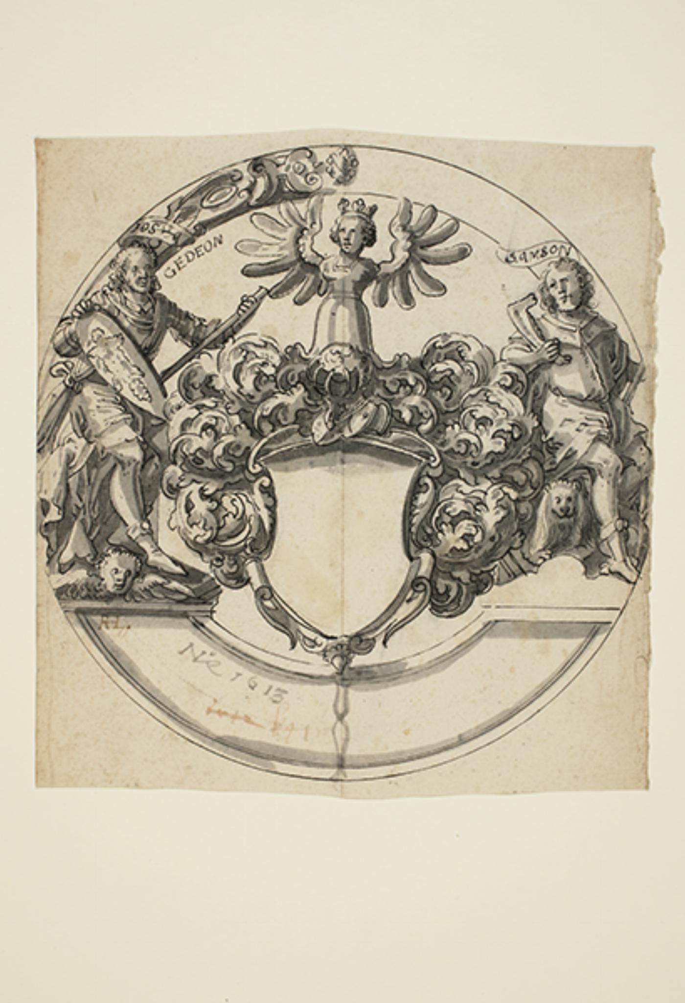 In einem runden Medaillon steht in der Mitte ein leerer Wappenschild unter einer Helmdecke und einem geflügelten und gekrönten Frauenrumpf als Helmzier. Darunter ist eine leere segmentförmige Inschriftentafel angebracht. Auf dieser stehen als Wappenhalter links Gideon (ursprünglich mit Josua beschriftet) und rechts Samson. Gideon hält einen Schild mit dem Goldenen Vlies in den Händen und Samson den Eselskinnbacken. Der abschliessende obere Rahmen ist nur links ausgeführt und bis zum Scheitel mit manieristischen Ornamenten geschmückt.