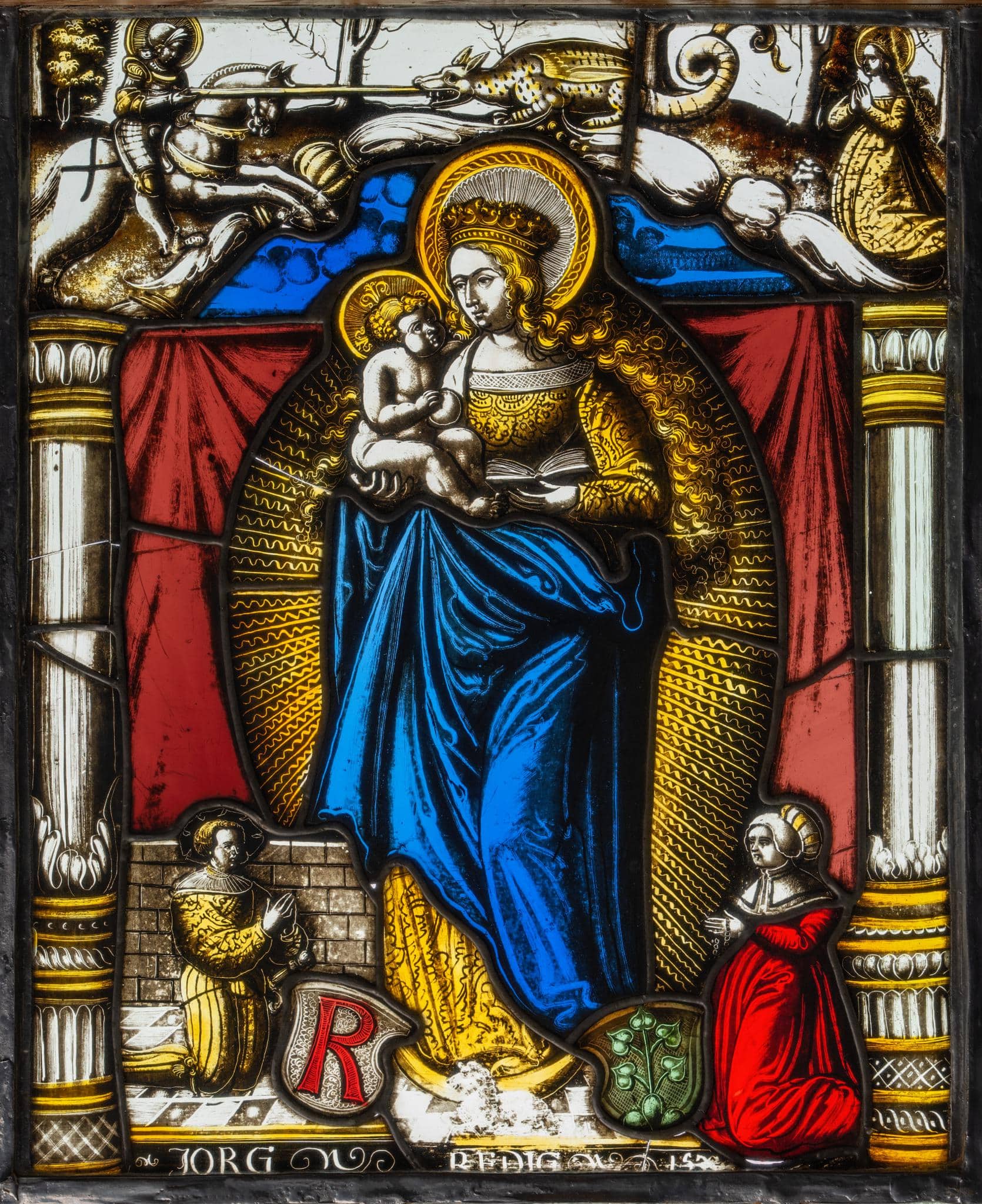 Aus ikonografischen Gründen dürfte die von Georg Reding und seiner Frau Dorothea Trachsler von Nidwalden kurz nach den Reformationswirren in Auftrag gegebene Bildscheibe mit der stehenden Mondsichelmadonna für einen Sakralbau bestimmt gewesen sein. In spätmittelalterlicher Tradition liess sich das jugendlich wirkende Paar zu Füssen Marias in fromm betender Haltung und in kleinerem Massstab darstellen, er in gelber Landsknechtenkleidung, sie in einem kostbaren roten Gewand. Im Jahr der Eheschliessung 1535 soll das Ehepaar diese Scheibe in den spätgotischen Vorgängerbau der heutigen Barockkapelle St. Georg in Arth gestiftet haben (Styger, 1936, S. 47). Als ursprünglicher Bestimmungsort ist allerdings die 1516 geweihte Reding-Kapelle in Oberarth ebenso wahrscheinlich. Darauf weist nicht zuletzt die Darstellung der gekrönten Mondsichelmadonna, der Patronin der Oberarther Marienkapelle. Obwohl die sakrale Ikonografie dagegen spricht, käme allenfalls auch das Haus zum Thürli (Gotthardstrasse 31a) in Oberarth in Frage (Hegner, 1966, S. 21). Dieses liess der frisch vermählte Georg Reding nämlich 1535, im Jahr der Scheibenstiftung also, als zukünftigen Wohnsitz erbauen.