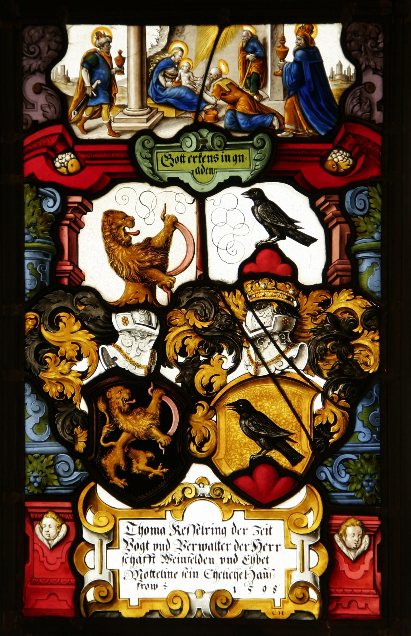 Vor schnurverziertem, farblosem Grund sind die Vollwappen Thomas Kesselrings und Elisabeth Möttelis auf die gelbe Inschriftenkartusche gesetzt. Zwei Pfeiler mit vorgeblendeten, reich verzierten blauen Säulen tragen das rote Gebälk, dessen grüne Scheitelkartusche die Stifterdevise nennt. Daran schliesst sich im Oberbild die Anbetung der Heiligen Drei Könige an.
