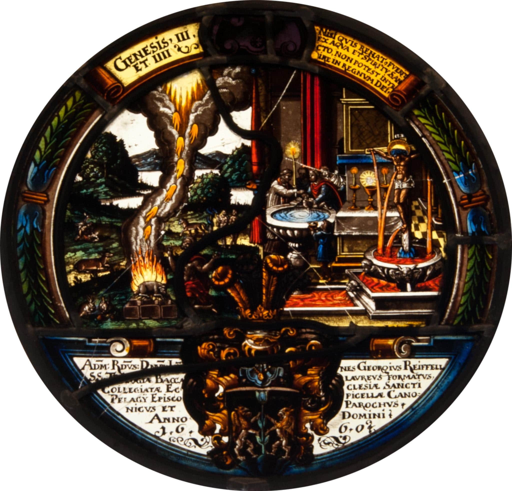 Hasler, R., & Keller, S. (2020). Runde Bildscheibe Johann Georg Reiffel mit dem Sündenfall, dem Opfer Abels und Kains Brudermord sowie dem Taufakt angesichts des gekreuzigten, sein Blut dem Brunnen spendenden Christus. In Vitrosearch. Retrieved December 13, 2025 from https://www.vitrosearch.ch/objects/2657381.