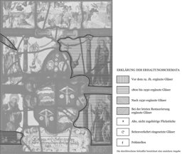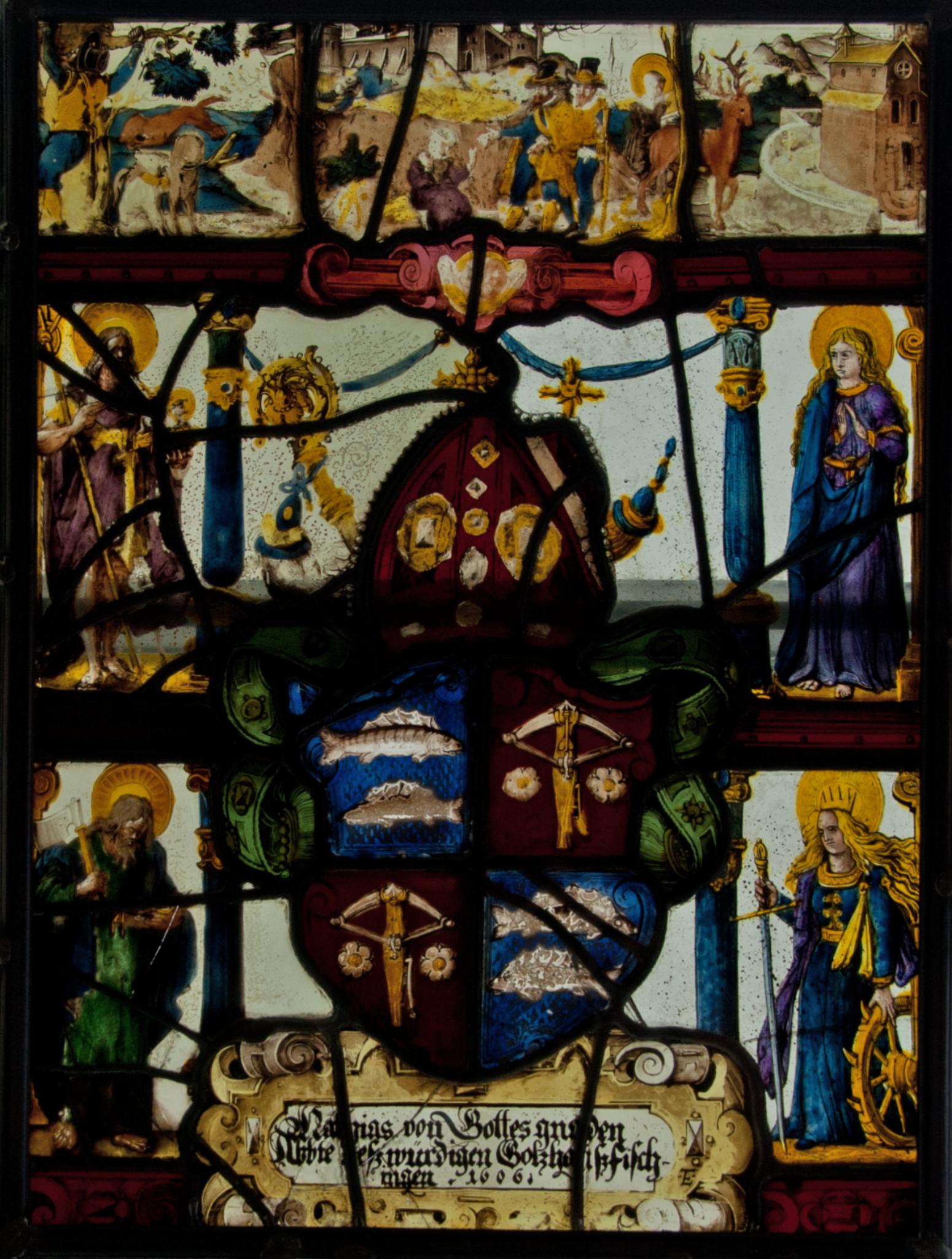 Die Scheiben Stähelins zeigen jeweils vier Heiligenfiguren. Bei der vorliegenden, von Tobias Erhart signierten Scheibe sind nur die linken beiden Figuren, Johannes der Täufer und der Apostel Matthias, original. Auf der ebenfalls von Erhart signierten Scheibe Stähelins von 1606 (TG_101) sind nur die unteren, Johannes der Täufer und die hl. Katharina original. Auf der Scheibe von 1610 sind wahrscheinlich alle Figuren original: oben links Johannes der Täufer, rechts Johannes der Evangelist, unten links der Apostel Matthias und rechts die hl. Katharina. Demnach entsprachen bei vorliegender Scheibe die heutigen ergänzten Stücke mit den Figuren des Johannes Evangelist und der hl. Katharina der ursprünglich vorhandenen Darstellung. Während zur Gründungszeit Maria die Patronin des Klosters Fischingen war, wurde später (ab 12. Jh.?) Johannes der Täufer Mitpatron. Zu Beginn des 17. Jh. wurden dann Johannes der Täufer und Johannes Evangelist als Patrone des Klosters Fischingen genannt. Die im Oberbild dargestellte hl. Idda trat seit der Gründung der Idda-Bruderschaft 1580 immer stärker in den Vordergrund und wurde Kirchen- und Klosterpatronin genannt. Ende des 17. Jh. wird dann neben Maria die hl. Idda zur eigentlichen Klosterpatronin (Meyer, 1976, S. 135f.) Die hl. Katharina erhielt 1637 unter Abt Placidus Brunschwiler eine Kapelle in Fischingen (Knoepfli, 1955, S. 83) und kam auf dessen Wappenscheiben wiederholt zur Darstellung. Offenbar war die Heilige bereits davor, unter Abt Matthias Stähelin, für Fischingen bedeutsam.