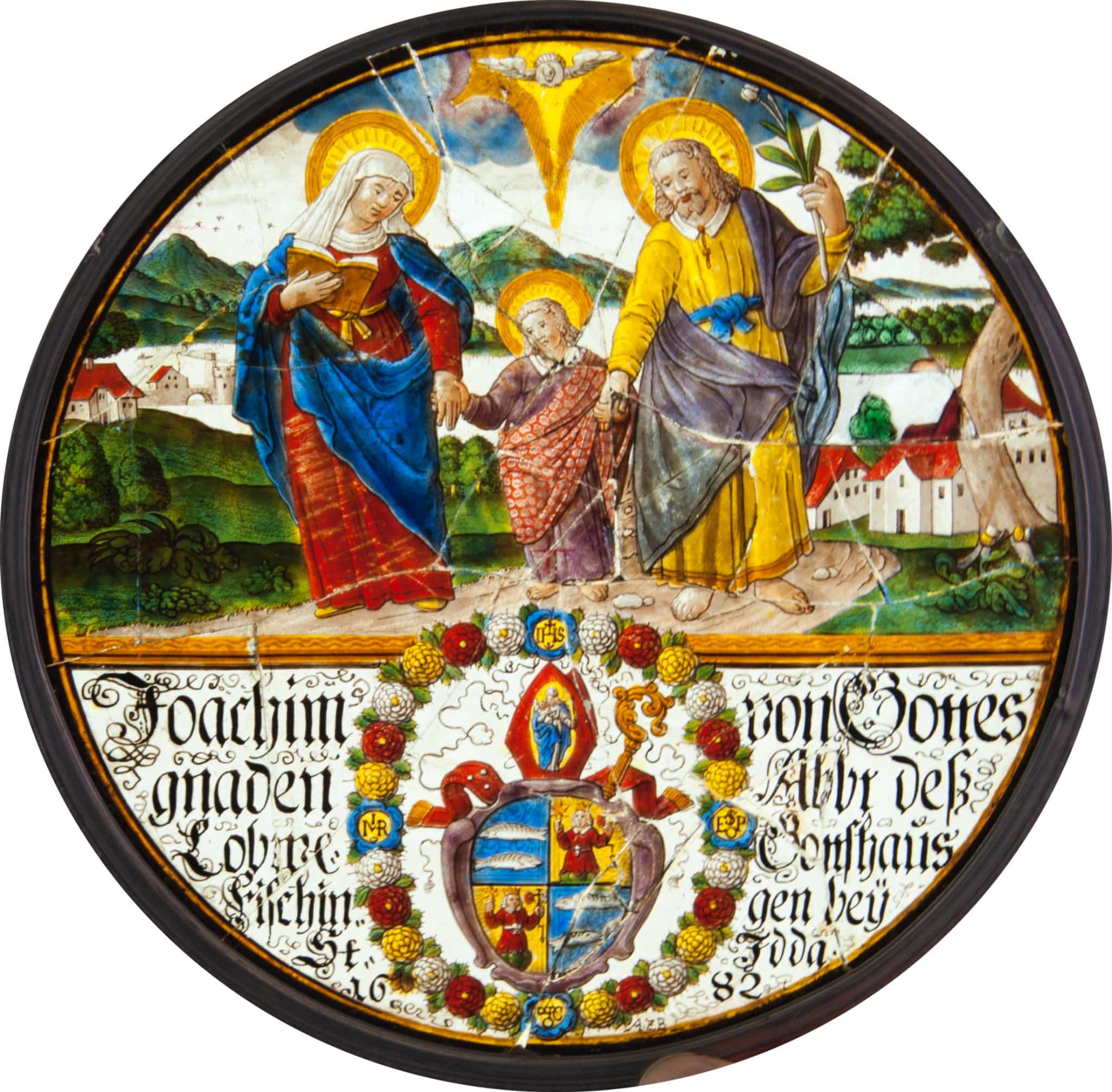 Hasler, R., & Keller, S. (2020). Runde Figurenscheibe Joachim Seiler, Abt Kloster Fischingen, mit der Heiligen Familie. In Vitrosearch. Retrieved December 13, 2025 from https://www.vitrosearch.ch/objects/2661181.