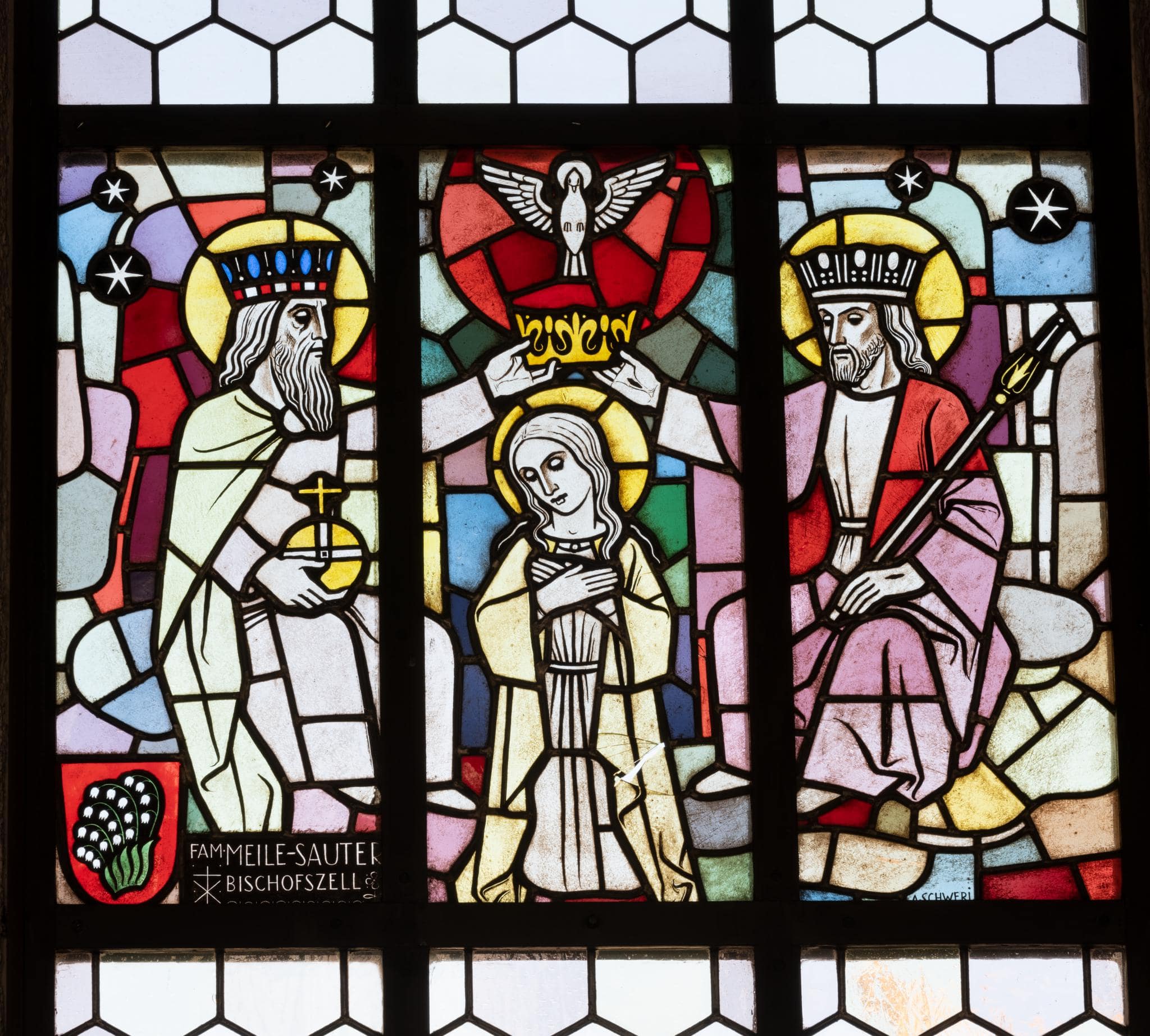 Maria kniet zwischen Gottvater und Christus im Himmel und wird von ihnen gekrönt. Über ihr schwebt die Taube des Heiligen Geistes. Gottvater hält den Reichsapfel, Christus das Lilienszepter in den Händen. Unten links ist das Stifterwappen angebracht.
