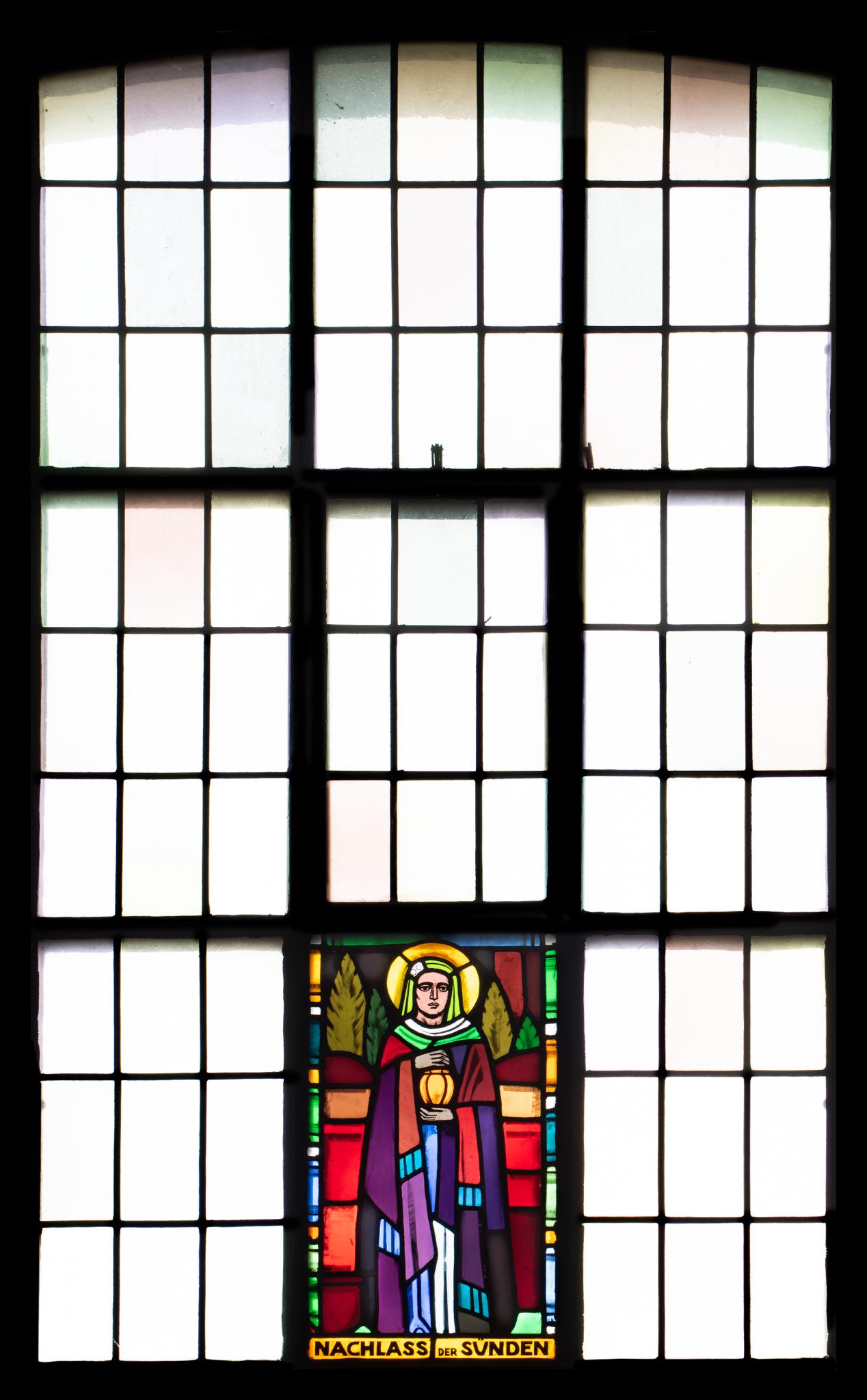 In zwölf Fenstern sind Sinnbilder des Apostolischen Glaubensbekenntnisses dargestellt. Hier steht die heilige Maria Magdalena als büssende Sünderin für die in der Inschrift und im Credo genannte Vergebung der Sünden. In den Händen hält sie das Salbgefäss.