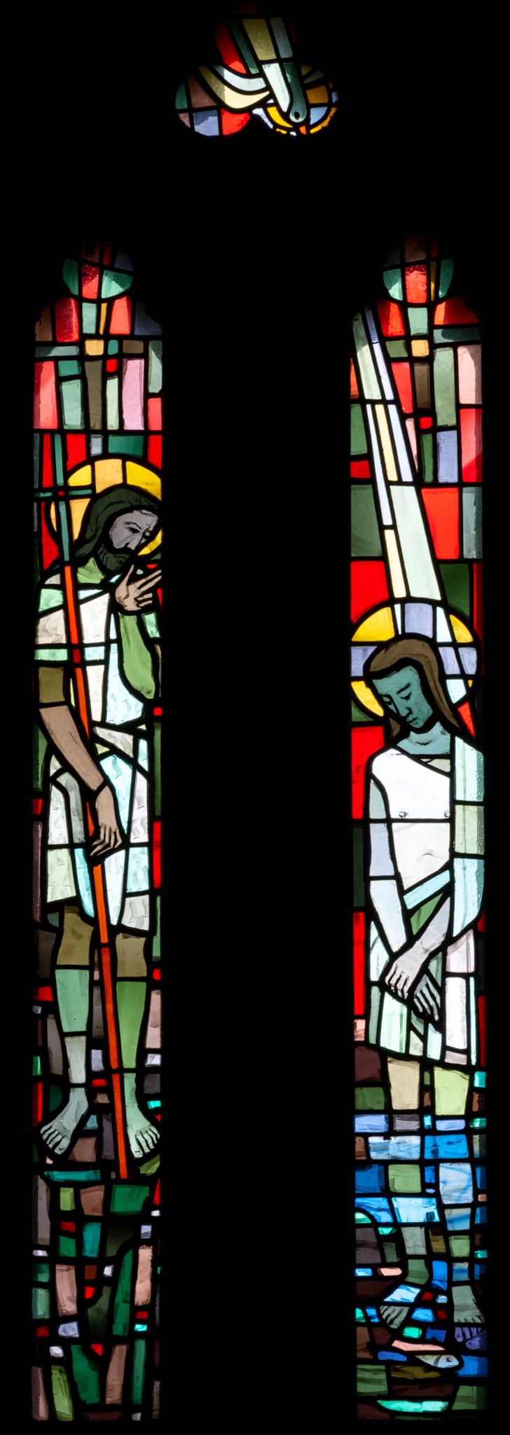 Zweilanzettiges Masswerkfenster (Nonnenköpfchen) mit der Darstellung der Taufe Christi durch Johannes den Täufer. Im Dreipass die Taube des heiligen Geistes.