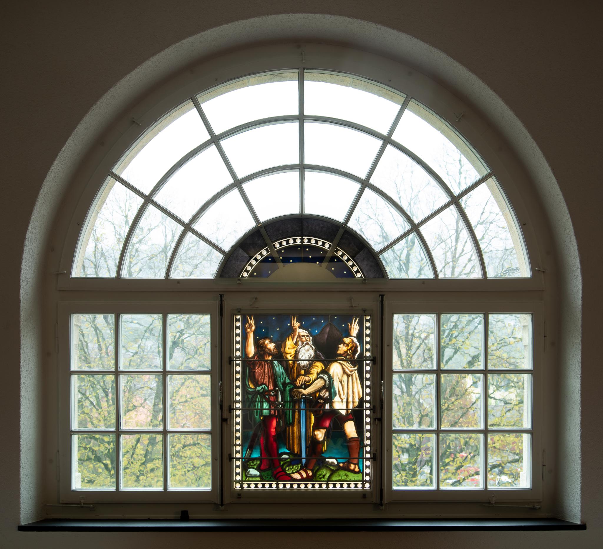 Vierteiliges Rundbogen-Sprossenfenster mit in der Mitte eingefügter farbiger Glasmalerei. Gezeigt sind die drei Eidgenossen auf der Rütliwiese mit zum Schwur erhobenen Händen. Gängigen Darstellungen des 19. Jahrhunderts folgend sind die Eidgenossen als Männer in drei Lebensaltern dargestellt: Arnold von Melchtal wird jugendlich dargestellt, Werner Stauffacher als Mann im mittleren Alter, und als älterer Mann mit weissem Bart ist Walter Fürst in der Mitte gezeigt. Im Hintergrund die nächtliche Berg- und Seelandschaft des Vierwaldstättersees. Die Bildszene ist durch einen Rahmen mit weissen Kreisen gefasst. Das Rütlischwur-Fenster ist eines von insgesamt drei Fenstern mit Glasmalereien zu Schweizer Nationalmythen (s. TG_1191 und TG_1193).