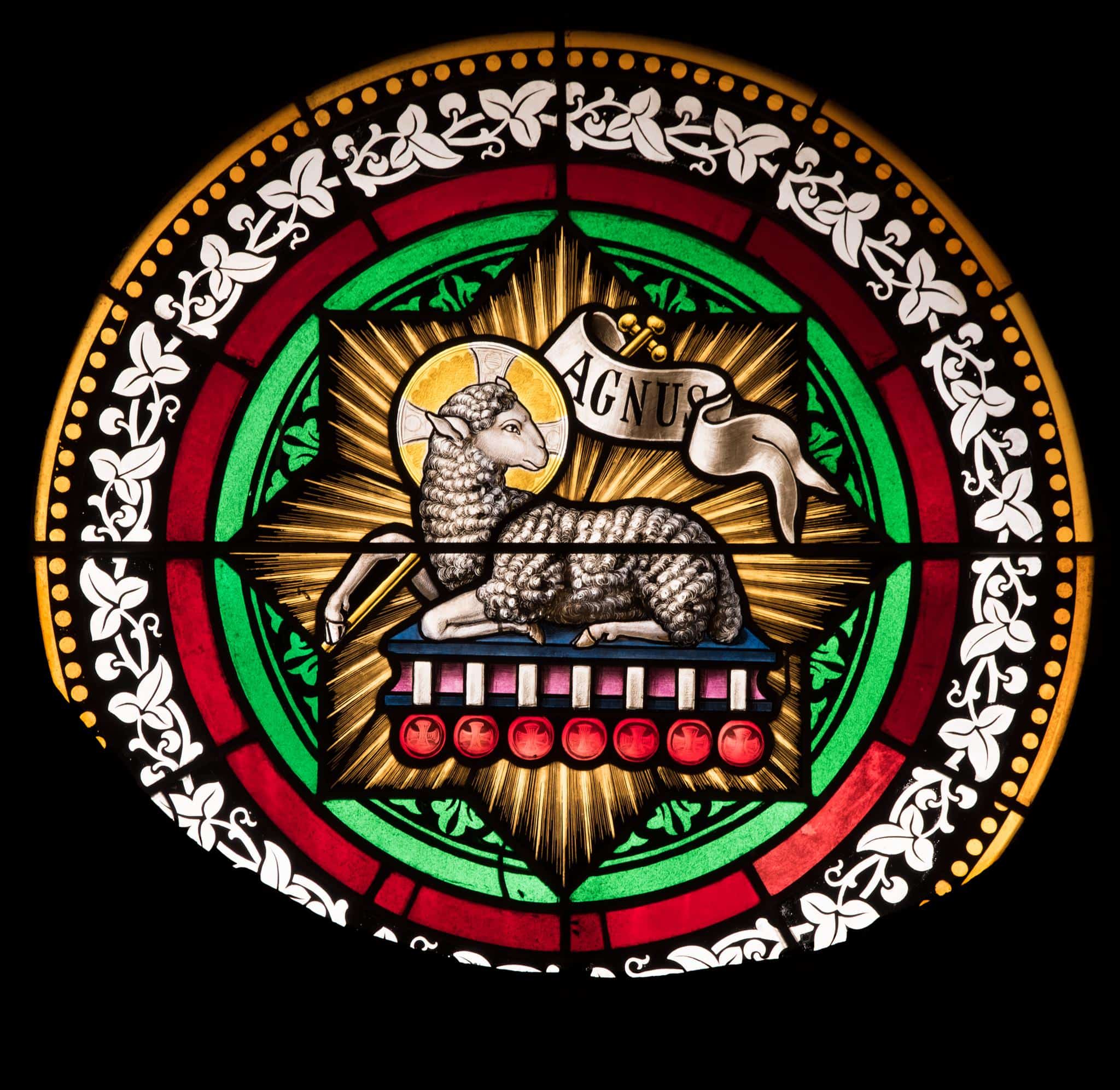 Das im Chor eingelassene Rundfenster ist Teil eines Zyklus, der vom bekannten Glasmaler Johann Jakob Röttinger (1817–1877) geschaffen und 1876 aus Anlass der Neuerrichtung des Kirchenschiffs eingesetzt wurde (Scheiwiller-Lorber, 2014, S. 324). In den drei Rundfenstern im Chor sowie in den Bogenausmündungen der acht Schifffenster, die ansonsten wie die Chor- und Emporenfenster eine einfache, gelb eingefasste Rautenverglasung aufweisen, sind Medaillons mit farbig gestalteten christlichen “Monogrammen” (Symbole, Bilder und Buchstabenfolgen) untergebracht. Mit Schwarzlot bemalt und hauptsächlich in den Farben blau, rot und gelb gehalten, zeichnen sich die Medaillons in Herdern durch kräftige Farbkontraste aus. Als “Chiffren” der Heilsgeschichte wurden solche Monogramme im dritten Viertel des 19. Jahrhunderts oft in katholischen Kirchen angebracht und häufig in ähnlicher Art ausgeführt. Ein Grund dafür liegt darin, dass es sich um eine kostengünstige Variante der Fenstergestaltung handelte. Vergleichbare Glasmalereien von Röttinger befinden sich bspw. in der katholischen Pfarrkirche von Alterswil FR (Scheiwiller-Lorber, 2014, S. 168–172). Womöglich handelt es sich bei den Glasfenstern der katholischen Kirche St. Sebastian um das letzte Werk Johann Jakob Röttingers.