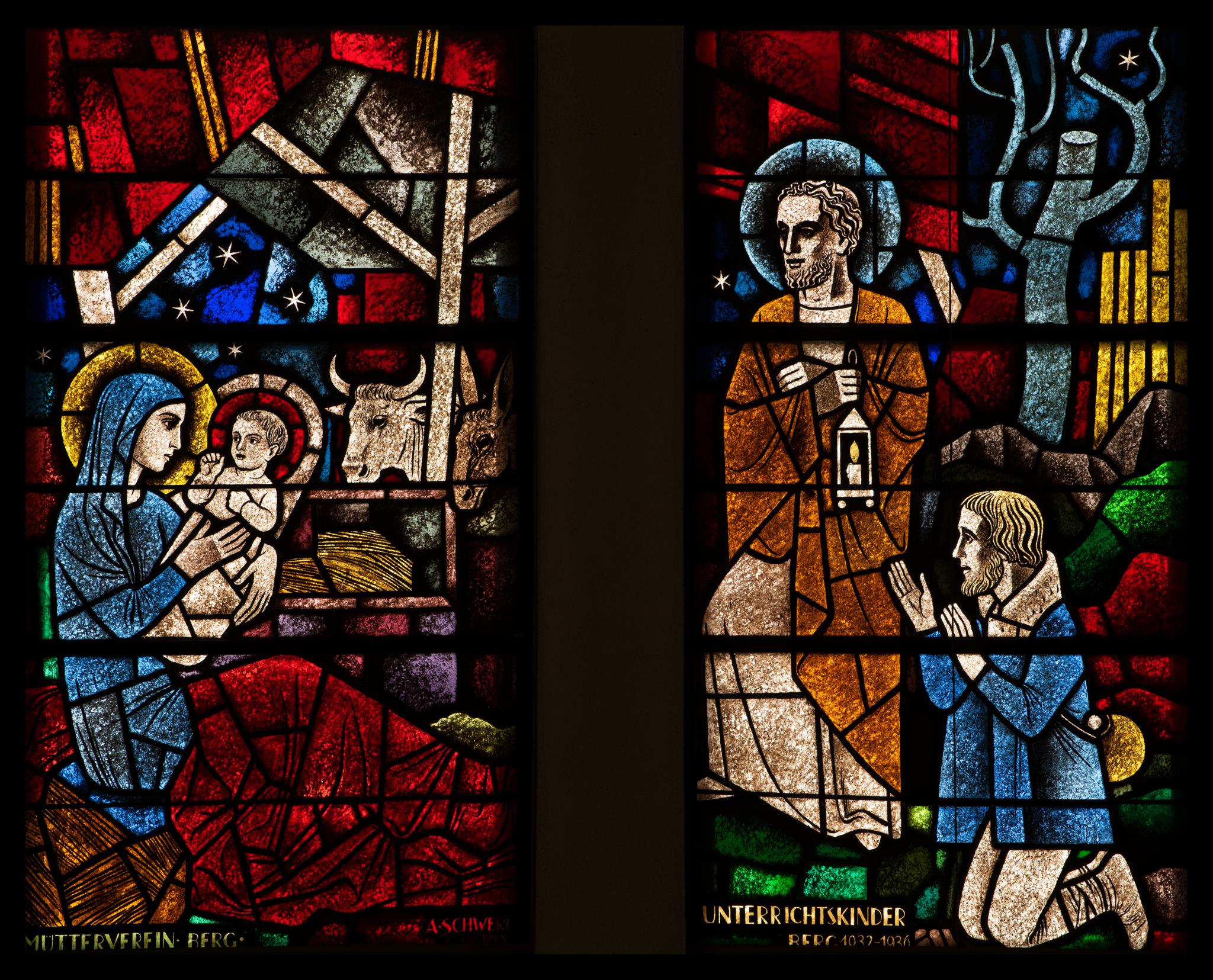 Hochrechteckige, schmale Fenster mit farbigen Rechtecken und Rahmenverzierung. Im unteren Drittel szenische Darstellungen aus dem Leben Mariens. Hier ist Christi Geburt dargestellt. Links liegt Maria mit dem Christuskind, rechts steht Joseph mit der Laterne, neben ihm kniet ein Hirte.