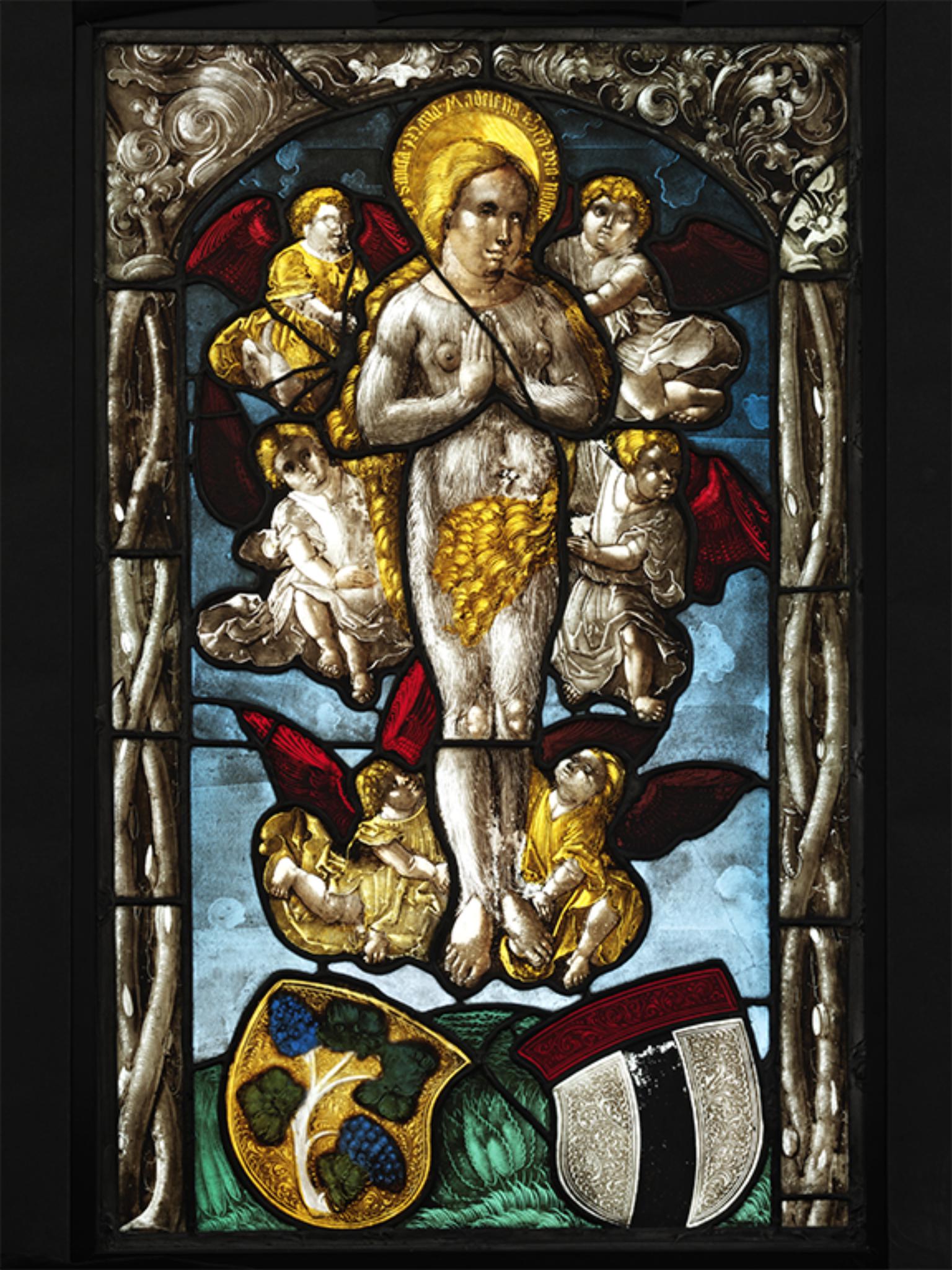 VAM_8: Vitrail historié aux armes de Baden : Apothéose de sainte Marie-Madeleine · Bildscheibe mit Wappen der Stadt Baden: Maria Magdalena