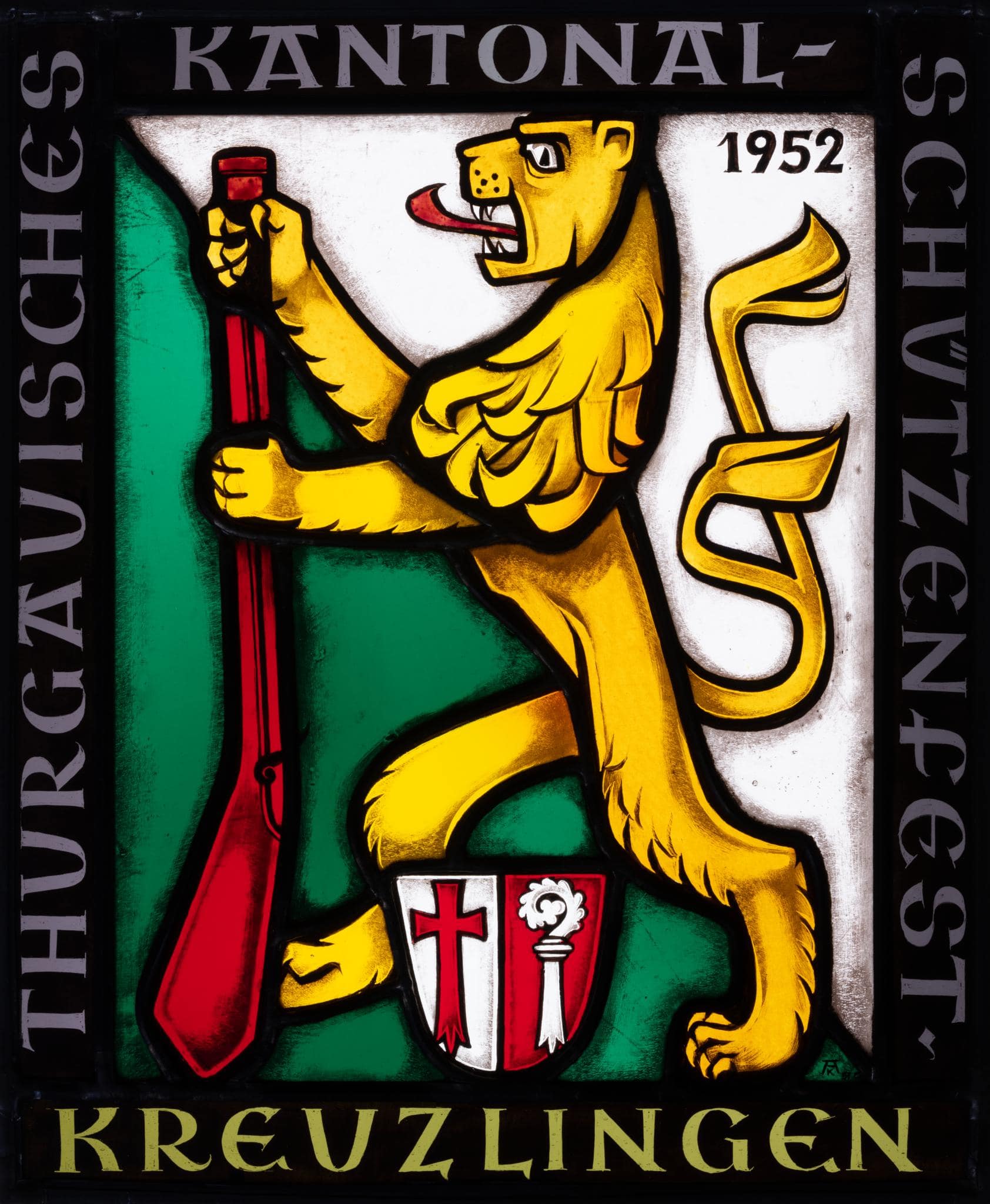 Wappen Thurgauischer Kantonal-Schützenverein (heute: Thurgauer Kantonalschützenverband): Schrägrechts geteilt von Grün und Silber, belegt mit doppelschwänzigen Löwen mit roter Zunge, eine rote Büchse pfahlweise vor sich haltend. Wappen Kreuzlingen: Gespalten von Silber mit rotem Kreuz und Rot mit silbernem Abtstab.