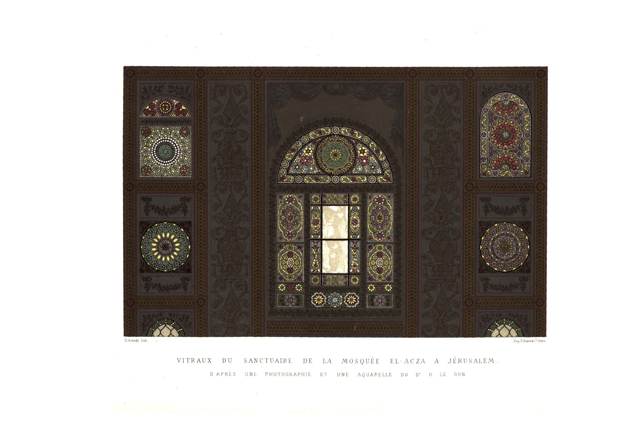 This plate showing the windows of the qibla wall of the Al-Aqsa Mosque in Jerusalem was made after a photograph and a watercolour by Gustave Le Bon. He explains how the chancellor of the French consulate in Jerusalem, M. Malpertuy (or Malpertuis), helped him and his team to colour the photographs on site. Le Bon only generally comments on the Al-Aqsa Mosque. He states that the windows over the mihrab date from the 16th CE century and that they had not been published before (Le Bon, 1885, p. 148).