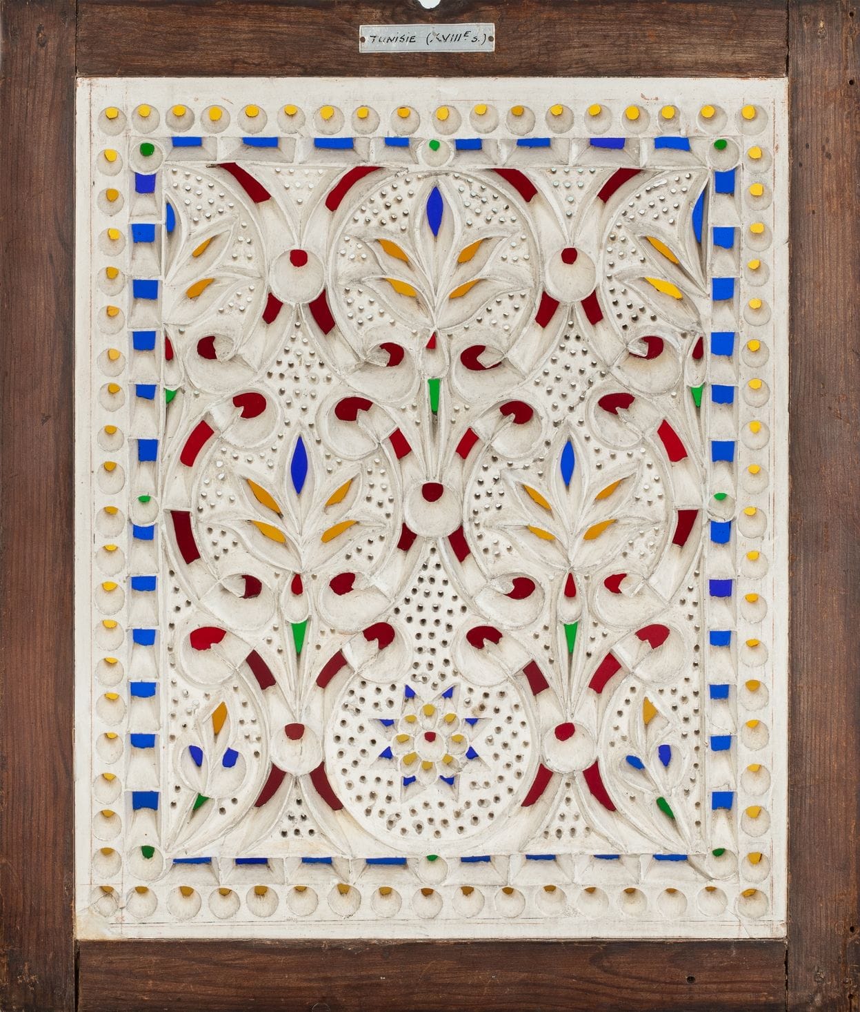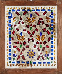 Latticework carved into a rectangular stucco panel with an average thickness of 13–15mm and inlaid with colourless and coloured pieces of glass. The pieces of glass are attached to the back of the panel by a thin layer of gypsum plaster with a thickness of 0.5–1.5mm.