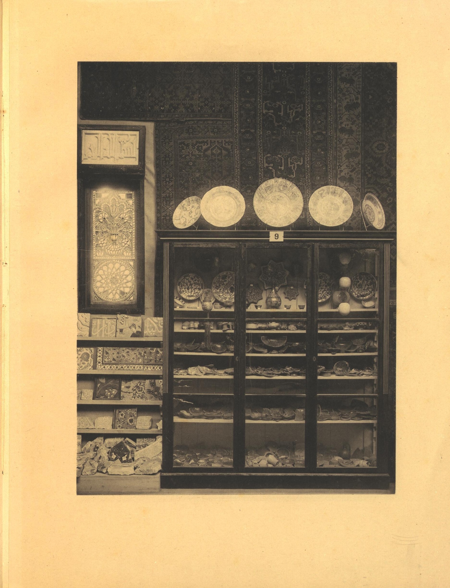 This catalogue accompanied the exhibition of objects from the ‘Orient’ from the collection of Frederik Robert Martin (1868–1933) at the General Art and Industrial Exposition of Stockholm in 1897 and includes photographs of the exhibition setting. The seventh exhibition view shows display case nine, tile fragments on a shelf, carpets hanging on the wall, and a stucco and glass window installed in the wall.