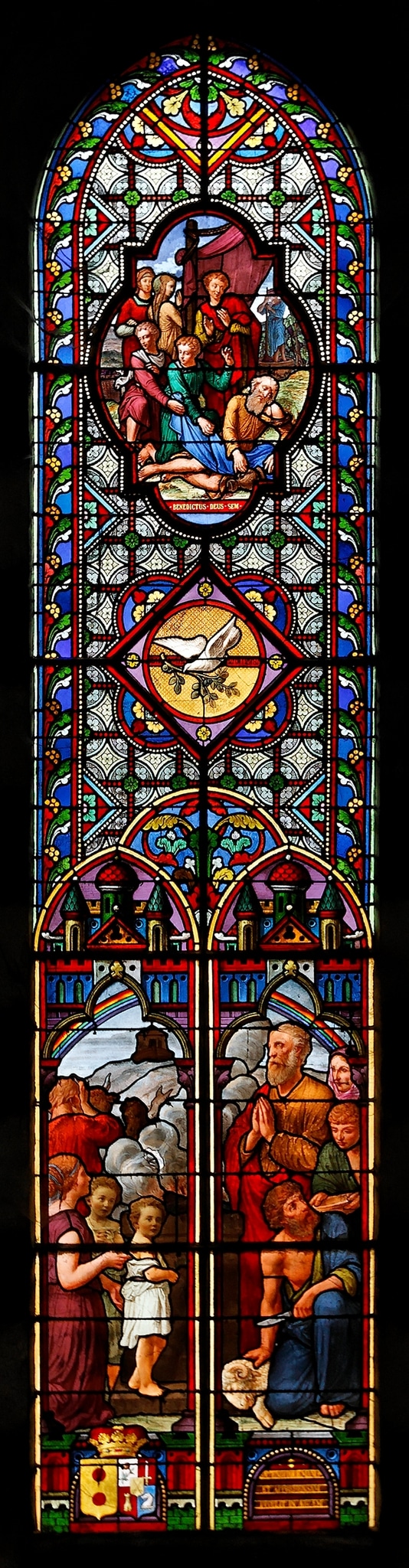 Spitzbogenfenster mit einer Bildszene in der unteren Hälfte des Fensters und darüber zwei Bildmedaillons auf einem im Stil der Gotik ornamentierten farbigen Hintergrund. Das Fenster ist Teil eines Zyklus zum Dogma der Unbefleckten Empfängnis Marias (immaculata conceptio). Der Zyklus thematisiert einerseits die Ankündigung des Mysteriums durch Präfigurationen Marias, und andererseits den Glauben an das Mysterium von seinen Anfängen bis zur Verkündung des Dogmas durch Papst Pius IX. am 8. Dezember 1854. Hier ist prominent das Dankopfer Noahs nach der Rettung zur Zeit der Sintflut (Gen 8, 20–22) und damit die Versöhnung Gottes mit den Menschen dargestellt. Der Patriarch Noah steht mit gefalteten Händen im Kreis seiner Familie, während ein Sohn zu seinen Füssen einen Widder opfert. Im Hintergrund sind ein Regenbogen und die Arche auf dem Berg Ararat zu sehen, beides auch Symbole für die Reinheit Marias. Die Bildszene ist über einem architektonischen Sockel mit Stifterwappen und Inschrift platziert und von schmalen Säulen und Baldachinen eingerahmt. Darüber erscheint in einem kleinen Medaillon die Taube, die Noah aussendete, und die mit einem Ölzweig zurückkehrte (Gen 8, 10–11). Im zweiten, darüberliegenden Medaillon ist die Trunkenheit Noahs gezeigt (Gen 9, 20–23); Sem und Jafet bedecken die Blösse ihres Vaters, in Analogie zur Jungfrau Maria, welche die Schande der Menschheit durch das Privileg ihrer unbefleckten Empfängnis bedeckt.