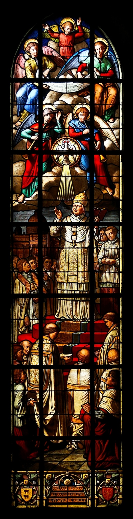 Eine von 41 Glasmalereien in der Basilika der Unbefleckten Empfängnis in Lourdes, die zu Ehren der Jungfrau Maria über der Grotte von Massabielle erbaut wurde. Dort soll die Jungfrau von Februar bis Juli 1858 insgesamt achtzehn Mal der 14-jährigen Bernadette Soubirous (1844–1879) erschienen sein. Die Glasmalereien der Kapellen in Langhaus und Chor berichten von diesen Erscheinungen und weiteren religiösen Höhepunkten in Lourdes Entwicklung zum wichtigsten Wallfahrtsort Frankreichs. Sie werden nach Eintritt in die Kirche von links nach rechts im Uhrzeigersinn gelesen. Die Glasmalereien im Obergaden von Langhaus und Chor thematisieren den Glauben an die unbefleckte Empfängnis (immaculata conceptio), von biblischen Präfigurationen bis zur Verkündung des Dogmas durch Papst Pius IX. am 8. Dezember 1854: seine Bulle Ineffabilis Deus hielt fest, dass die Jungfrau Maria ohne den Makel der Erbsünde empfangenen worden sei. Die Fenster im Obergaden werden zuerst von links zum Chor hin gelesen und danach von rechts zum Chor hin. Durch die Orgel verdeckt ist das Rosenfenster mit Mariensymbolen (?) in der Hauptfassade.
