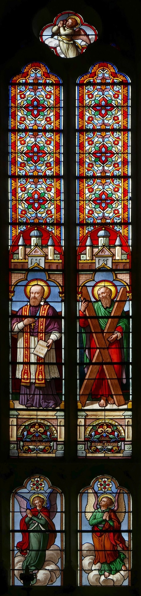 Zweilanzettiges Masswerkfenster, das zusätzlich horizontal in einen oberen und einen unteren Bereich gegliedert ist. Im Couronnement stehender Vierpass. Im Zentrum der Lanzetten sind links Franz von Sales und rechts der Apostel Andreas als Ganzfiguren dargestellt. Der heilige Franz von Sales ist als Priester mit einer reich bestickten roten Stola gezeigt und hält seine 1609 erschienene Publikation «Anleitung zum frommen Leben» (Philothea) in der linken Hand. Der heilige Andreas ist mit seinem Attribut, dem Andreaskreuz aus zwei diagonal verlaufenden, sich kreuzenden Balken abgebildet. Die Figuren stehen auf architektonischen Sockeln mit ihrem Namenszug und sind eingefasst von schmalen Säulen und einem Baldachin. Der obere Bereich der Lanzetten ist mit farbigen geometrischen Blattmustern im Stil der Gotik dekoriert. Im darüberliegenden Vierpass erscheint ein betender Engel. Im unteren Bereich der Lanzetten sind zwei weitere Engel auf Wolken zu sehen; sie bilden eine grössere Gruppe mit den in den übrigen Chorfenstern untergebrachten Engeln.