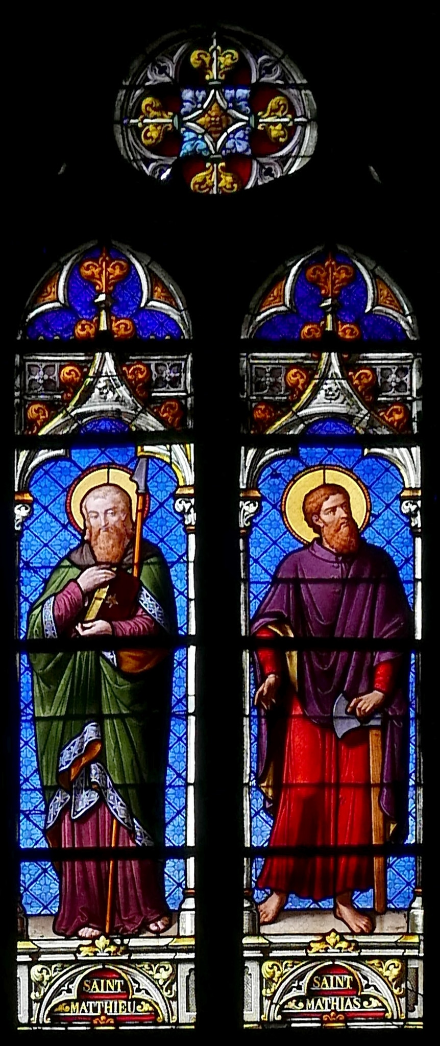 Zweilanzettiges Masswerkfenster mit zwei Aposteln als Ganzfiguren auf blauem Grund: links Matthäus mit dem Evangelium und einer Lanze als Attribut, rechts Matthias mit einer Axt. Die Figuren stehen auf einem architektonischen Sockel mit dem jeweiligen Namenszug und sind von schmalen Säulen flankiert, über denen sich Baldachine im Stil der Gotik erheben. Die kreisrunde Öffnung des Couronnement ist mit konzentrisch angeordneten Blattornamenten und einem Masswerk-Vierpass dekoriert.