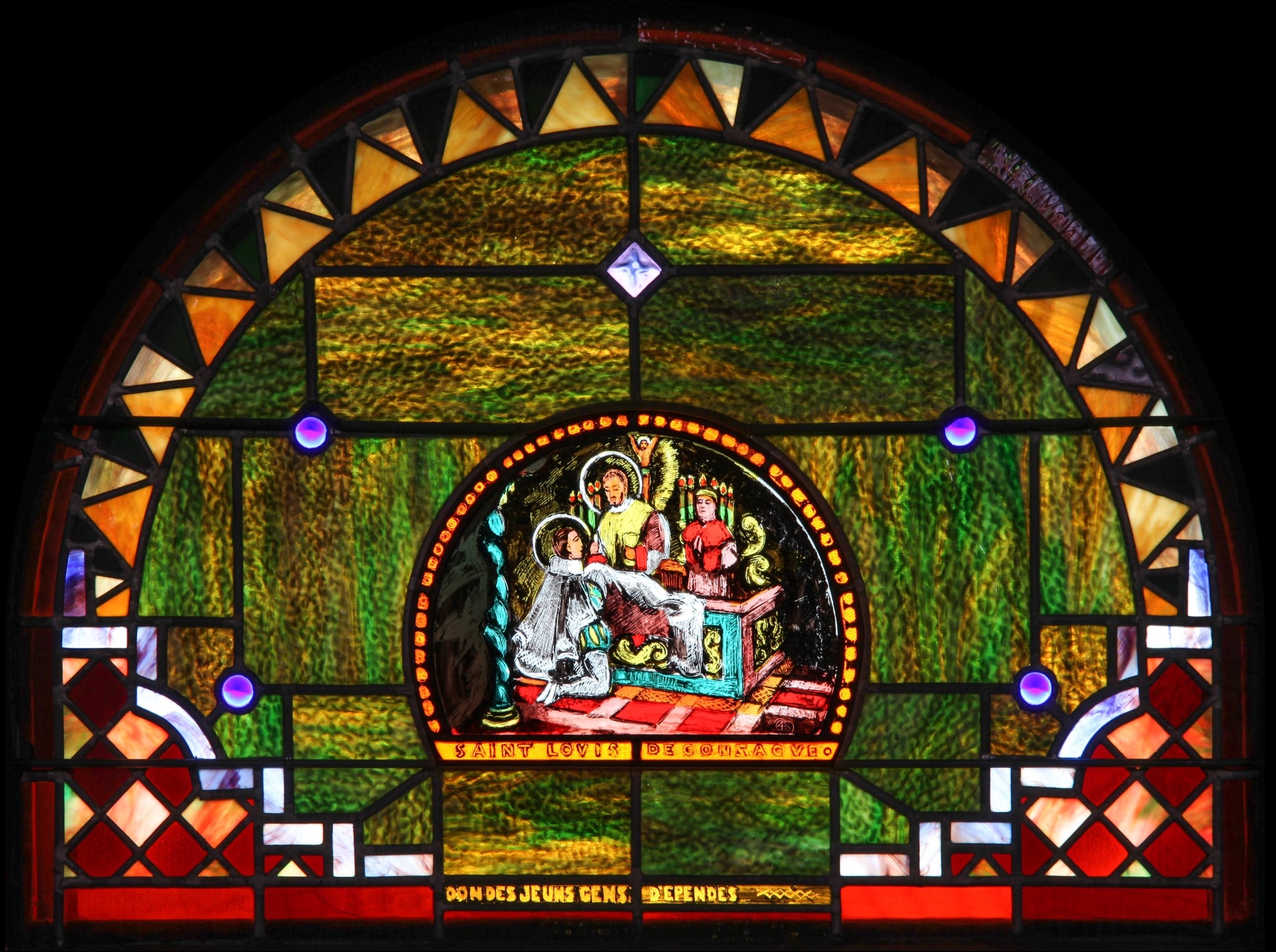 Vitrail en demi-cercle composé d’un médaillon au centre et encadré d’une large bordure ornementale. Dans le médaillon figure Louis de Gonzague, agenouillé de profil, priant devant un chancel derrière lequel se tient saint Charles Borromée, lui tendant le calice et l’hostie de sa première communion. A droite se tient un enfant de choeur ou servant d’autel debout les mains jointes. On devine à l’arrière-plan un autel avec un crucifix entouré de cierges allumés. Une colonne torse au premier plan suggère l’architecture de l’intérieur de l’église, plongée dans la pénombre.
