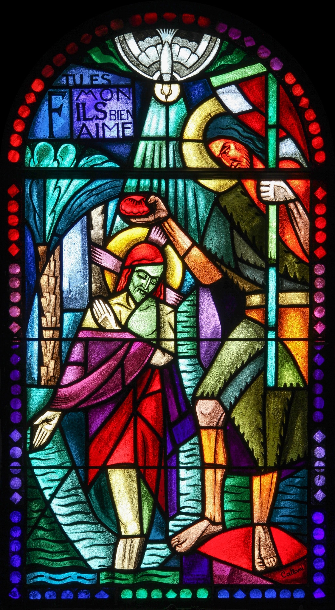 En août 1935, alors que les vitraux des fenêtres hautes de la nef sont posés depuis quelques semaines, la commission de bâtisse n’a pas encore décidé à qui des deux artistes (Cingria ou Cattani) elle souhaite octroyer la réalisation des verrières des bas-côtés. Elle préfère préalablement demander l’avis de Cuony (Ruffieux et Dousse, 1935). Son choix se porte sur Cingria pour l’ensemble des huit verrières des bas-côtés, tandis que Cattani reçoit la commande du vitrail du baptistère, qu’il réalise à nouveau en collaboration avec l’atelier Kirsch et Fleckner (Kirsch et Fleckner, 1935). Situé à côté de la porte d’entrée, il se présente quelque peu en retrait par rapport aux autres fenêtres et offre l’opportunité à Cattani d’exprimer pleinement sa personnalité artistique. Contrairement aux fenêtres hautes où il était contraint de suivre le modèle défini par Cingria (bien qu’il ait malgré tout réussi à s’affirmer stylistiquement), il peut se déployer plus librement à travers cette petite fenêtre. Un baptistère se voulant un lieu intime, il choisit des couleurs denses, (bleu, turquoise, rouge, violet) et crée un dessin franc, tout en angles, n’hésitant pas à donner une carnation turquoise au visage du Christ pour répondre à la dominante des tons froids développés sur la partie gauche du vitrail. A droite, Jean-Baptiste est au contraire baigné d’une lumière chaude, apportée par des teintes passant par un dégradé de verts et par la carnation jaune orangée de son visage et de ses membres.