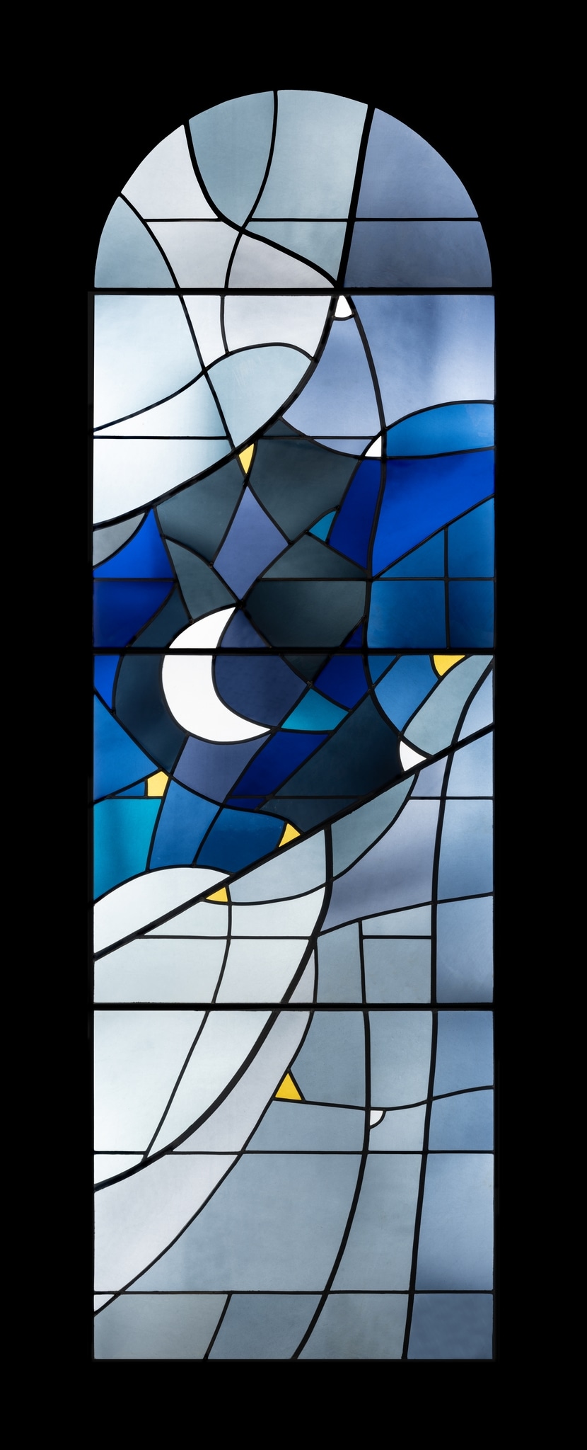 Elle décide de faire commencer la lecture du cycle à l’entrée de la nef, désireuse que le dernier vitrail, évoquant la mort, domine le choeur. Elle envisage la succession de ses verrières ainsi : “Frère Soleil s’arrache à la nuit dans un feu de teintes chaudes, la lune le suivant dans un ciel sombre d’astres éclatés. Puis souffle le Vent bleu et noir sur les monts. L’eau ruisselle en diagonale diaphane avant que le Feu n’embrase le vitrail suivant. Viennent les fruits, posés dans le cercle de la Terre. Ils sont la vie qui renaît de la mort. La Mort clôt l’émerveillement de François et donne sens à cette succession, non pour l’anéantir mais pour ouvrir une porte vers la lumière. Les Flammes de la Résurrection sont jetées sur l’ombre de la planète. Celles-ci s’élèvent à travers la Croix glorieuse. Les couleurs du premier vitrail sont en partie reprises, alors que le rythme des plombs de l’ensemble écrit dans le ciel l’unité de la vie” (Tabin-Darbellay, 2021, p. 18).