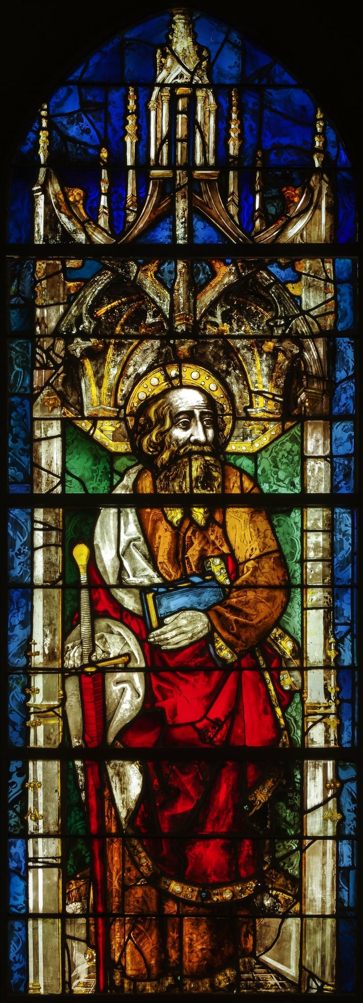 Le vitrail de Paul a été fortement restauré au fil des siècles et comporte de nombreux compléments et lacunes, parmi lesquels une partie du dais. Cependant, au vu des similitudes entre le sommet des verrières de saints Paul et André, il est probable qu’elles soient issues d’un même atelier (Aballéa, 2020, p. 48). Le vitrail d’André étant attribué pour des raisons stylistiques au peintre et verrier Antoine de Lonhy, il est possible que le présent vitrail ait également été exécuté dans l’atelier de ce maître.