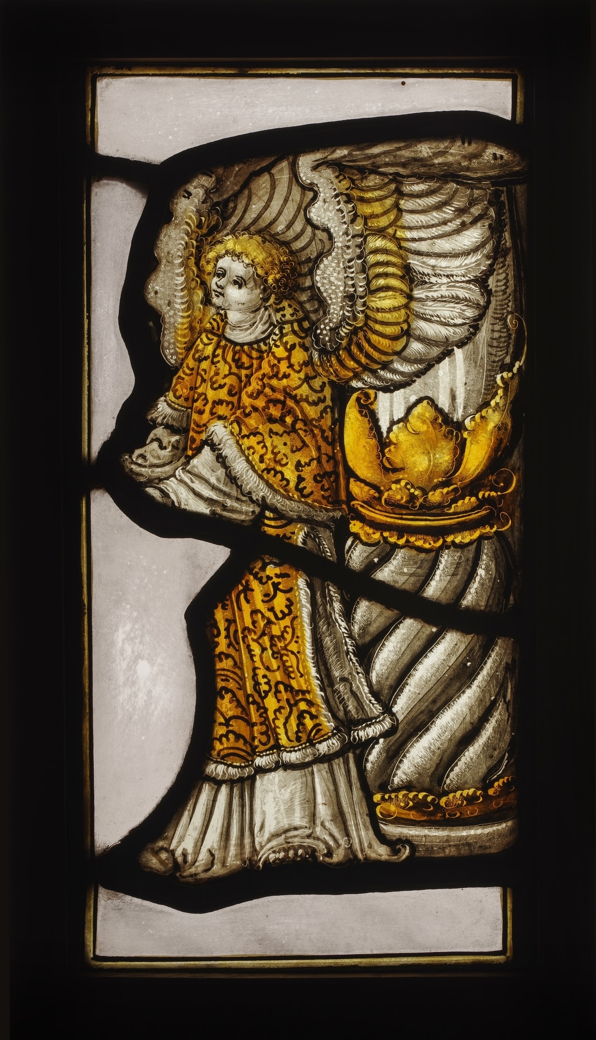 Fragment de vitrail représentant un ange en pied, vêtu d’une tunique blanche et dorée. Ses ailes se déploient devant une colonne torsadée.