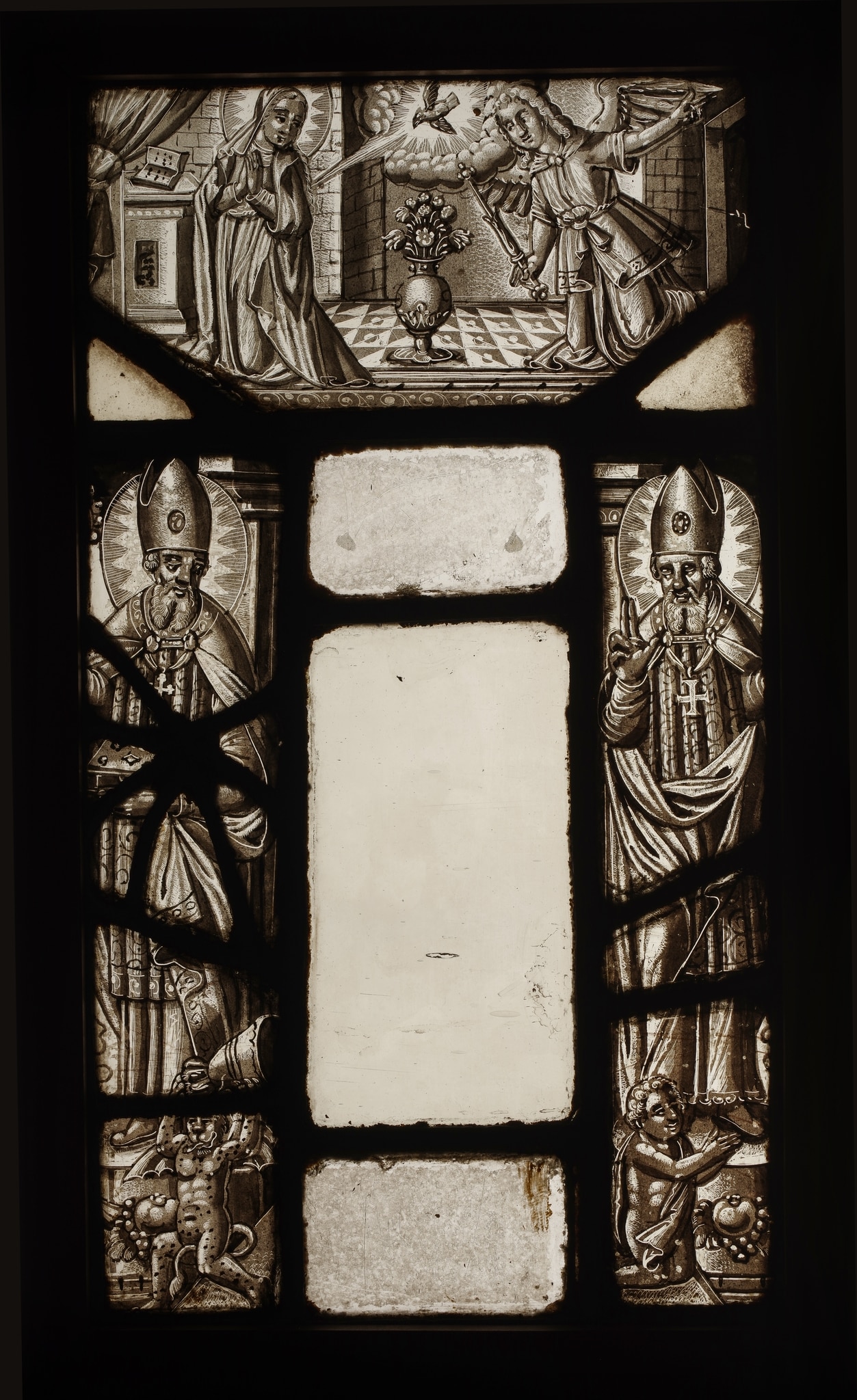 Vitrail fragmentaire dont seul le cadre architectural demeure. A gauche figure saint Théodule nimbé portant une mitre, tenant une crosse épiscopale ainsi qu’un livre et regardant à ses pieds un démon qui porte une cloche. A droite se trouve un personnage nimbé non identifié portant une mitre et faisant de la main droite un geste de bénédiction, avec à ses pieds un petit personnage nu agenouillé. Dans la partie supérieure figure une Annonciation, avec à droite la Vierge Marie en prière et à gauche l’archange Gabriel agenouillé.