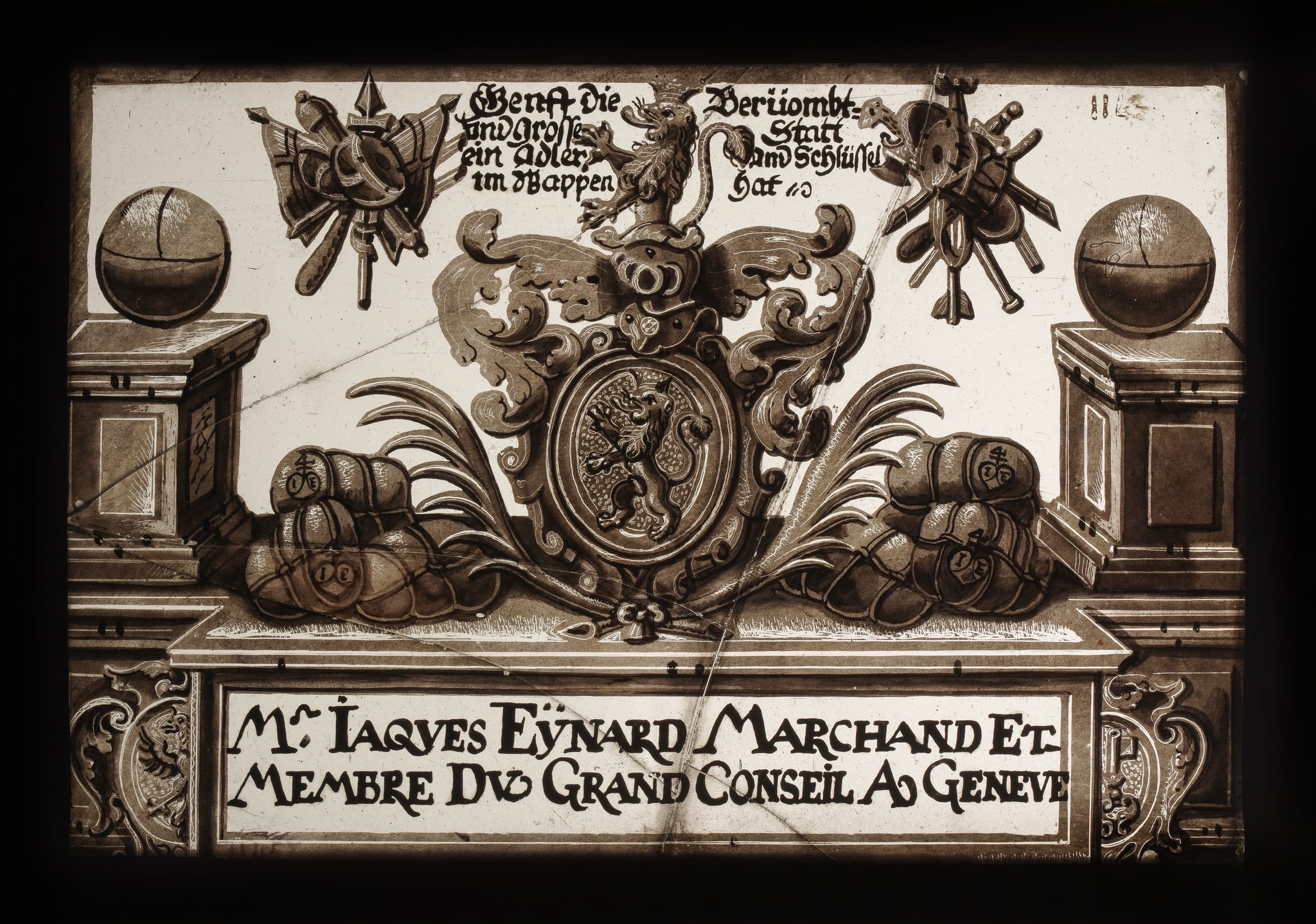 Vitrail monolithe rectangulaire représentant un soubassement avec un blason surmonté d’un heaume à lambrequins et d’un cimier formé d’un protomé de lion couronné. De part et d’autre figurent des emblèmes de commerce et des trophées militaires. Le soubassement orné de l’inscription du donateur est flanqué d’un écu aux armes de Genève scindé en deux.