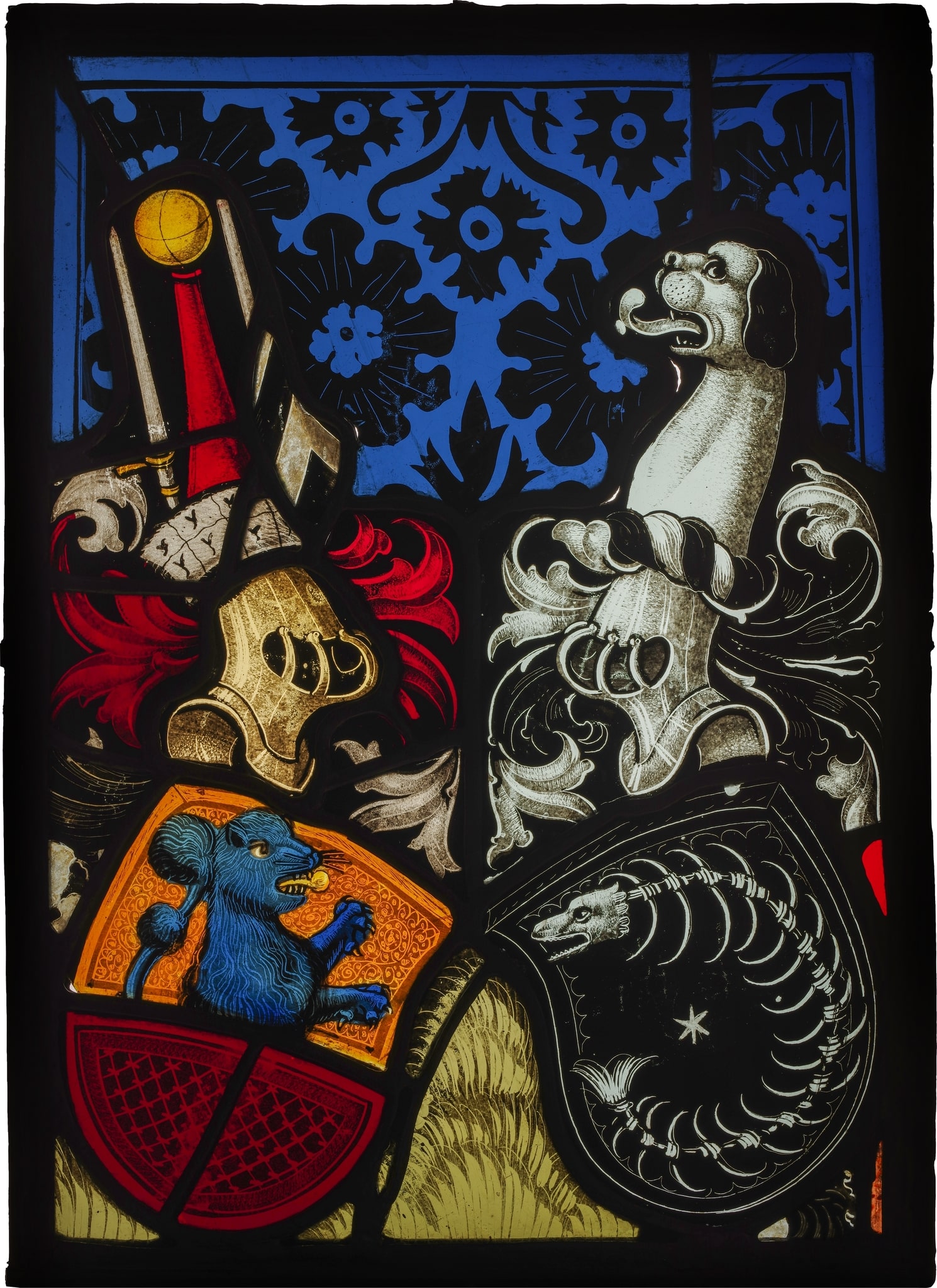 L’analyse visuelle des verres questionne la datation de ce panneau, car certaines pièces paraissent bien plus récentes que d’autres. Il pourrait toutefois s’agir de compléments ultérieurs, sans mettre en doute l’authenticité du vitrail. En 1890, dans le catalogue de la collection Vincent, Rahn évoque brièvement ce vitrail armorié en indiquant qu’à part quelques fissures et l’absence de cadre, il est en excellent état (Rahn, 1890, p. 188, n° 18). Si une mise en plomb et un encadrement a eu lieu entre la fin du XIXe ou du début du XXe siècle, il est possible que des compléments aient également été insérés à ce moment-là.
