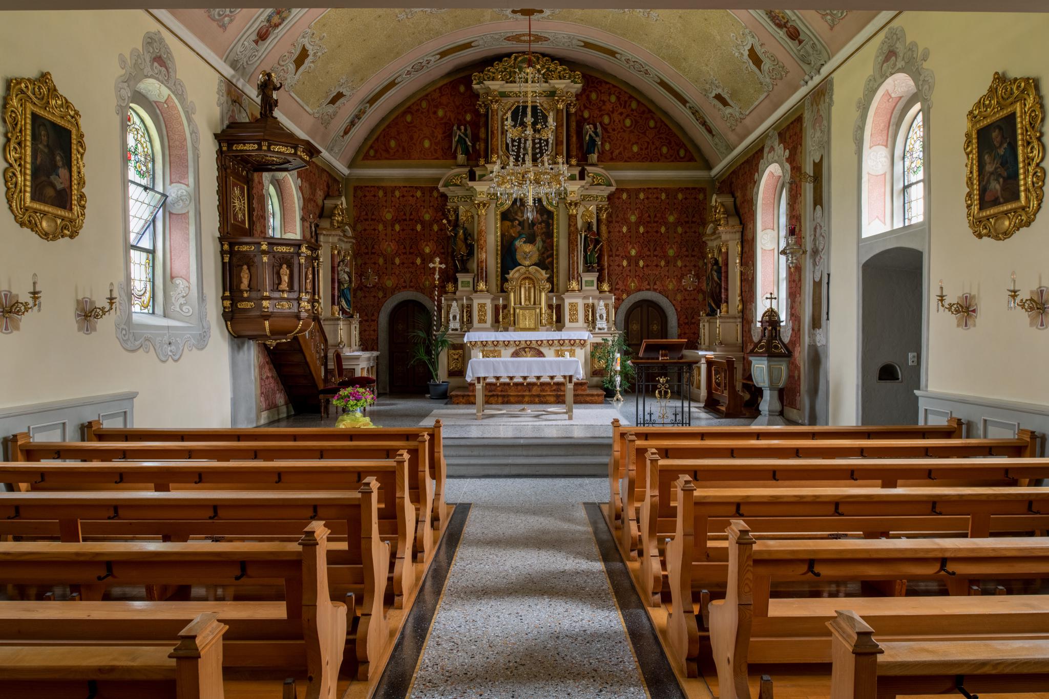 1706–08 an Stelle einer kleinen Kirche durch Josef Matthias Wisle errichtet und dabei Turmchor und Turmschaft erhalten. Damals wurde Hans Balthasar Gallati aus Wil für Fensterarbeiten beigezogen (Knoepfli, 1955, S. 387). Die heute erhaltenen Glasmalereien im Stil des Neorokoko wurden wohl 1903 eingesetzt (Knoepfli, 1955, S. 387).