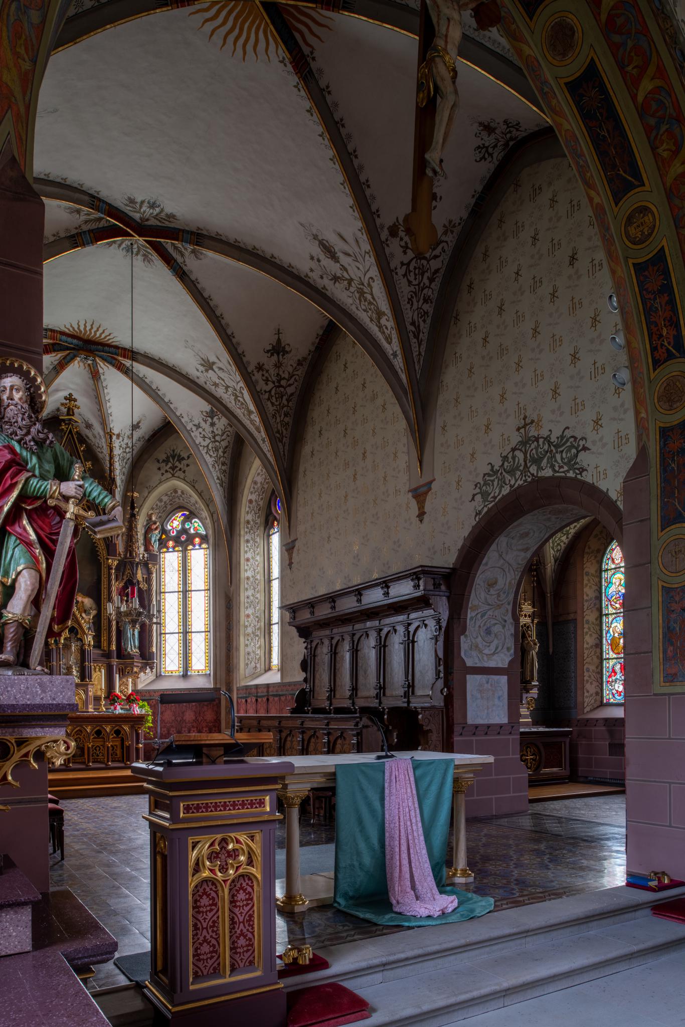 Im 12./13. Jh. wurde die vorromanische Kapelle vergrössert und in der 2. Hälfte des 15. Jh. sowie kurz nach 1500 umgebaut. Restaurierungen 1840 nach einem Erdbeben, 1892/93 (Arch. August Hardegger) sowie 1983/84. Zweischiffige Anlage mit mittelalterlichem Hauptschiff, Polygonalchor und südlich durch Arkaden getrenntem Seitenschiff von 1504. Grabkapelle der Familie Muntprat. Bis 1966 paritätisch genutzt. 1865 neue Verglasung. 1893 lieferte Karl Holenstein Bordürenfenster für das Langhaus, ein Heiligenfenster für die Muntprat-Kapelle und vermutlich auch die neuen Chorfenster.