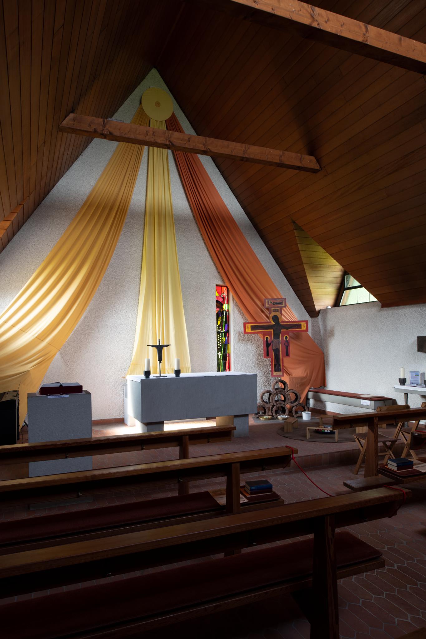 Die von Gertrud Huber-Brast (1900–1982) gestiftete ökumenische Kapelle wurde 1959 von Oskar Müller erbaut. Glasgemälde von Hans Stocker.