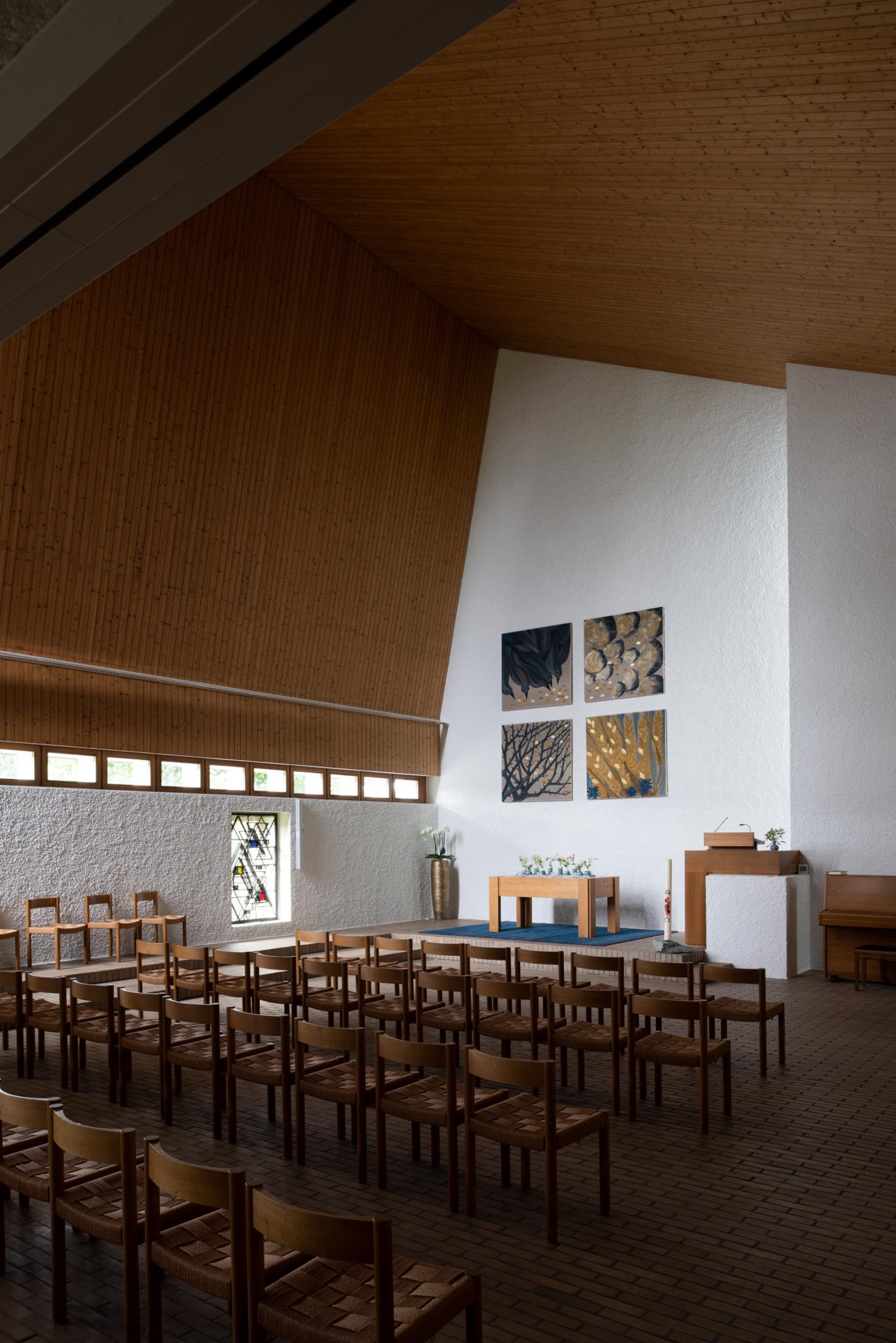 1965–66 von Kräher und Jenni erbaut. Glasgemälde von Paul Stöckli.