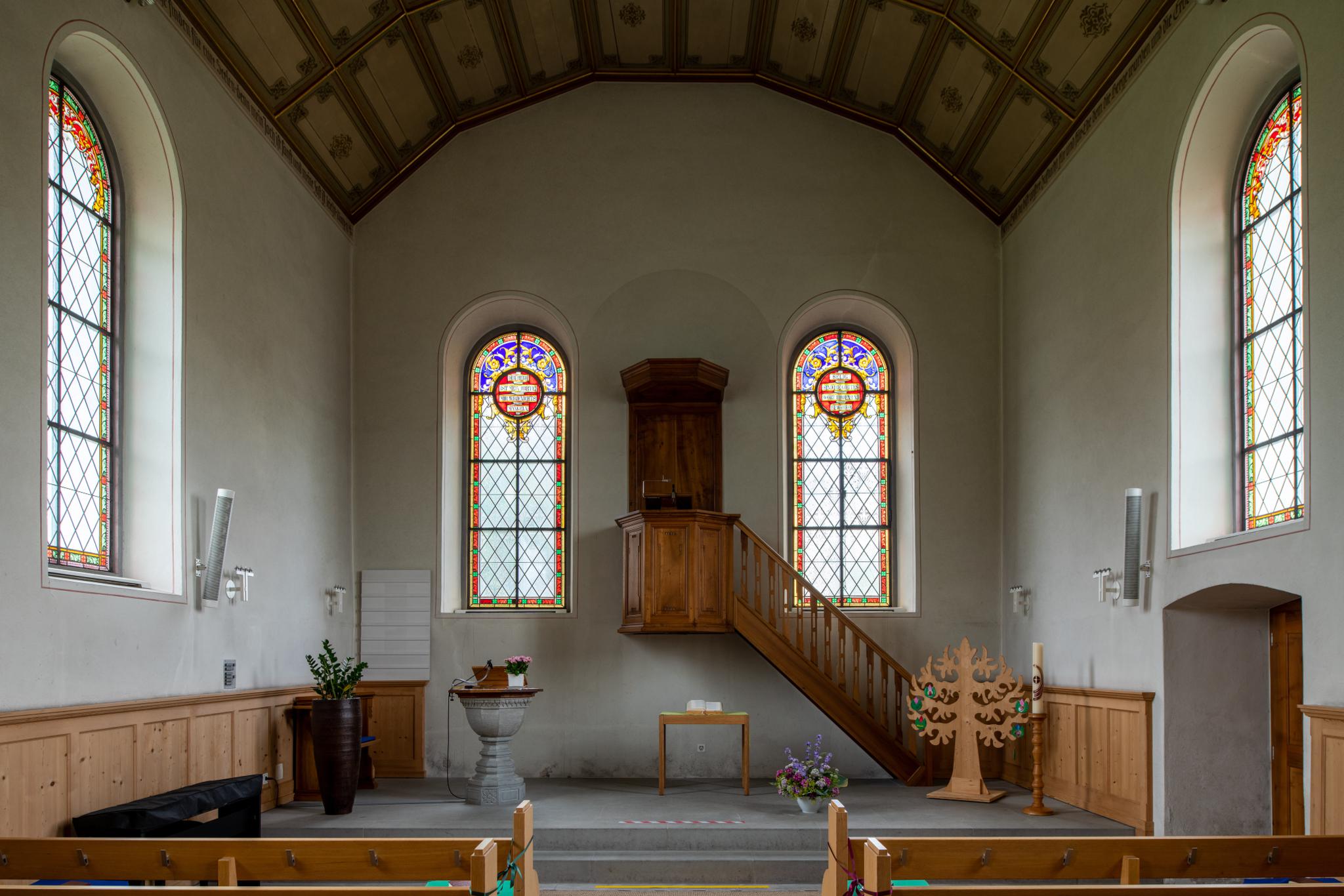 Schlichter Rechteckbau von 1805–07. 1891, 1933 und 1994 renoviert. Bei der Renovation 1891 schuf Karl Wehrli acht neue Rundbogenfenster. Am 9. September 1891 bestätigt Wehrli den Erhalt einer Zahlung von 450 Fr., am 27. Jan. 1892 wird ein Obligo mit Wehrli (verbindliche Haftung) abgeschlossen (evang. Kirchgemeindearchiv Braunau, Belege zur Kirchenrechnung pro 1891). Die beiden Chorfenster zeigen je ein Inschriftenmedaillon, die sechs Schifffenster eine schlichte ornamentale Rahmung aus grünen Blättern und roten Blüten (s III, s V, n III, n V) resp. gelben Blättern und blauen Blüten (s IV, n IV).