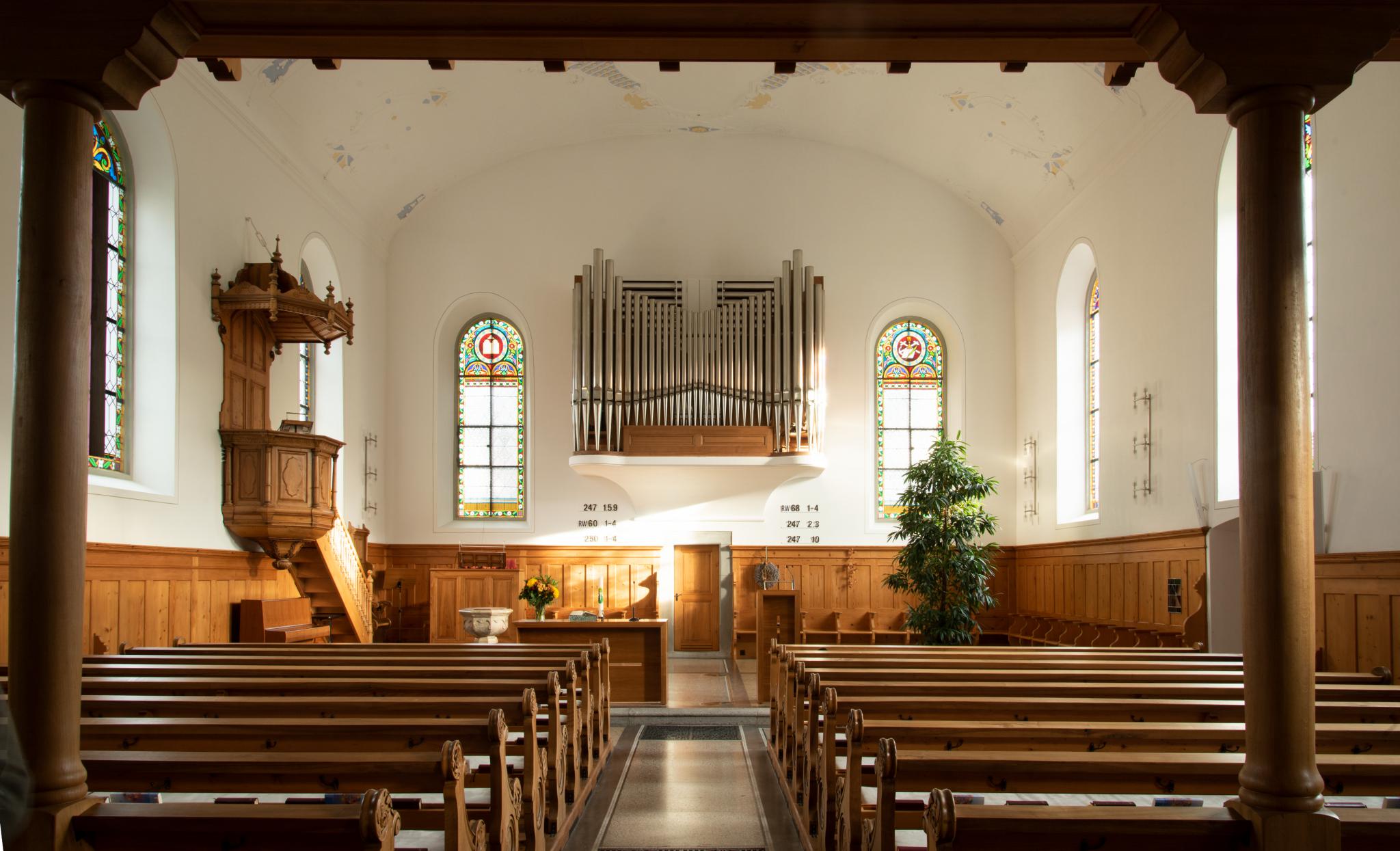 1746 erbaut von Hans Jakob Fisch(er). Schlichter Baukörper unter Giebeldach, im Osten spitzhelmiger Frontturm. Saalförmiger Innenraum. Renoviert 1899, 1951, 1995/96 (aussen), 2005 (innen). Glasmalereien aus dem Jahr 1881 von Friedrich Berbig, Zürich.