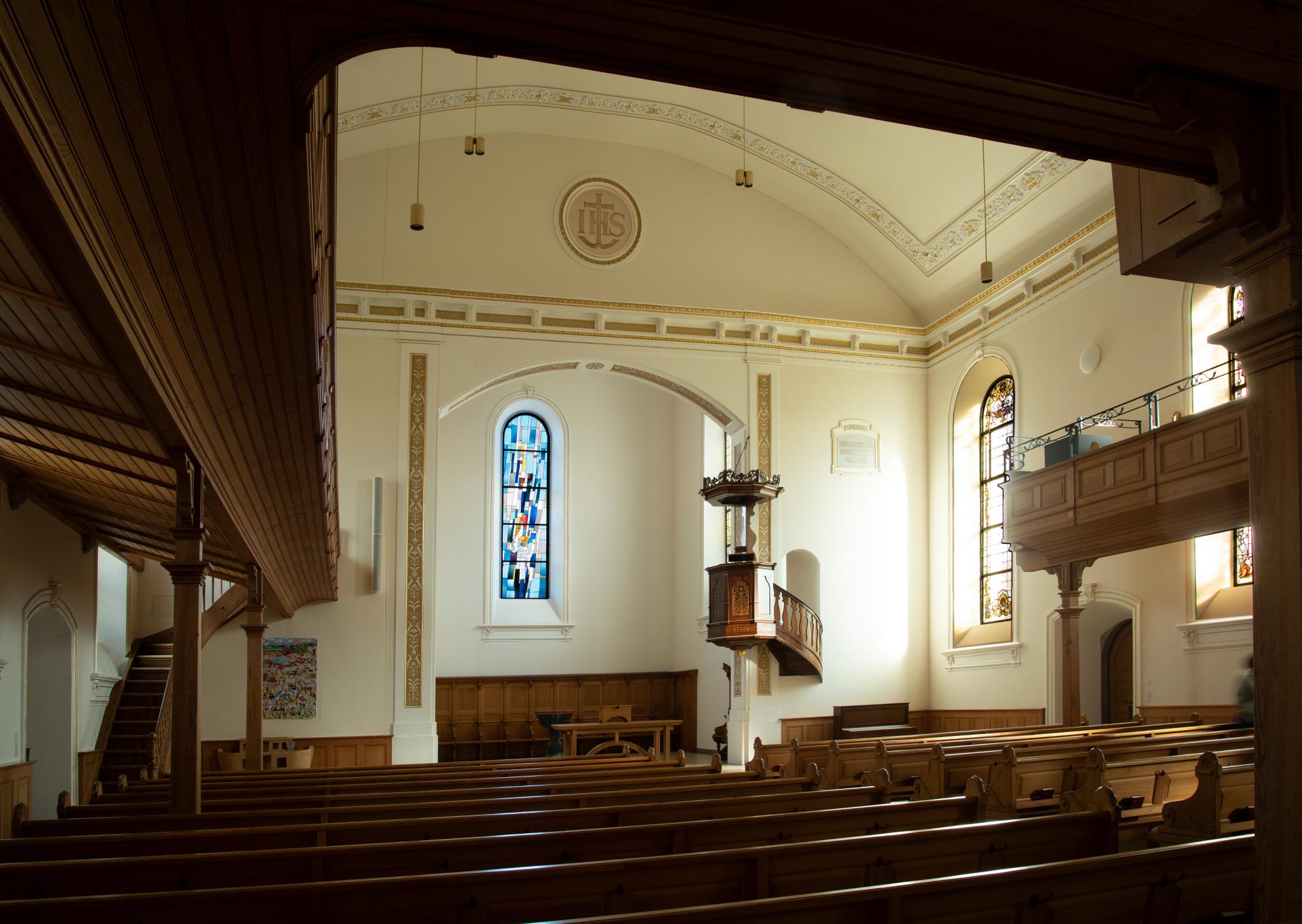 Langrechteckiges Schiff und eingezogener Rechteckchor unter stattlichem Giebeldach; im Westen durchlaufendes, säulengetragenes Pultdachvorzeichen, im Nordosten Turm (1755 renoviert und nach einem Blitzschlag 1888 mit neuem Glockengeschoss und Helm versehen). Im Inneren dreiseitig umlaufende Empore und um zwei Stufen erhöhter Chor, von 1888 stammen die gemalten Neurenaissance-Dekorationen.
