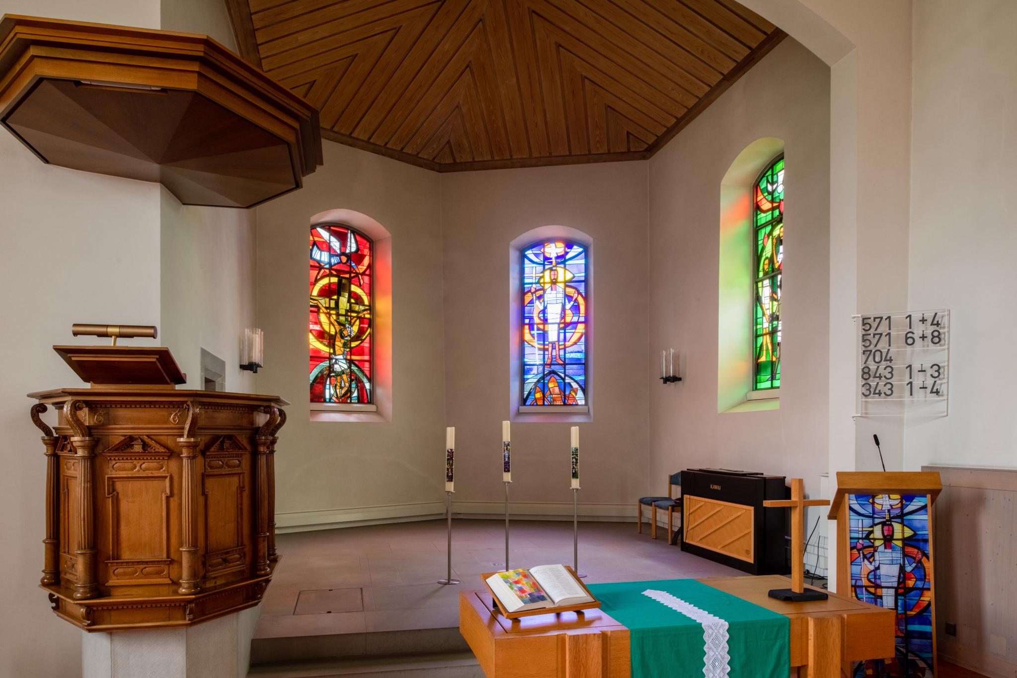 Spätgotischer Chorabschluss und Turm. 1835 zu asymmetrischem Schiff ergänzt. 1885 Renovation durch August Keller; Neugestaltung 1967–68. Chorfenster von Hans Affeltranger 1969.
