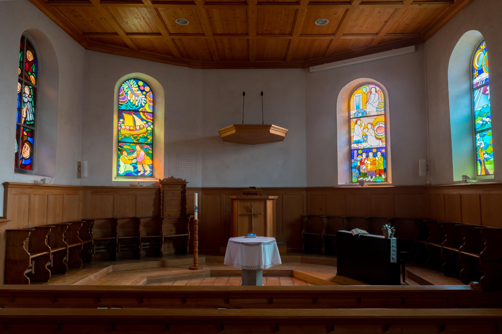 Anstelle einer Nikolauskapelle, von der nur wenige Mauerreste erhalten sind, 1766 neu erbaut. Renoviert 1888 und 1965–66. Schlichte dreiseitig geschlossene Anlage, spitzhelmiger Dachreiter. Weihnachtsfenster 1950 von Willy Fries, weitere Glasmalereien von Willi Hartung und Kundry.