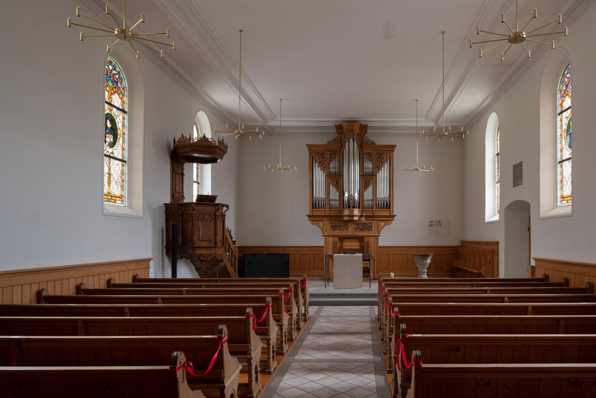 1746 erbaut. Schlichter Rechteckbau mit Satteldach, neogotischer Eingangsturm um 1900 von Otto Meyer. 1937 modernisiert, restauriert 1992–93. Glasmalereien mit den Reformatoren Zwingli und Luther in Medaillons von Friedrich Berbig (1900).