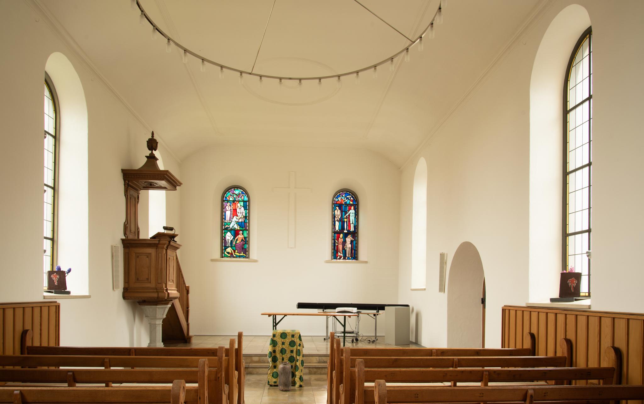 Erbaut 1429, 1644 erweitert. 1927 und 1957 renoviert. Chorstirnfenster von Carl Rösch aus dem Jahr 1957.