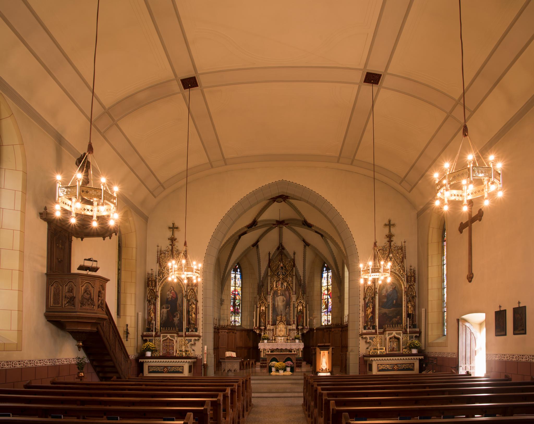 1. H. 15. Jh., Schiff 1414 (?), Altarweihe 1439, Sakristeibau 1442, Chor Ende 15. Jahrhundert mit Sterngewölbe. Der spätgotische Turm wurde ab 1858 im oberen Teil modernisiert (Spitzhelm). Zahlreiche Renovationen, u. A. 1907–1909 durch Albert Rimli. 1977–1979 Gesamtrenovation durch Hermann Schmidt. Innenausstattung in “Wiler Schreinergotik” um 1908. 1534–2019 paritätisch genutzt. Glasmalereien von 1887/88, 1903, 1903/04 und 1908.