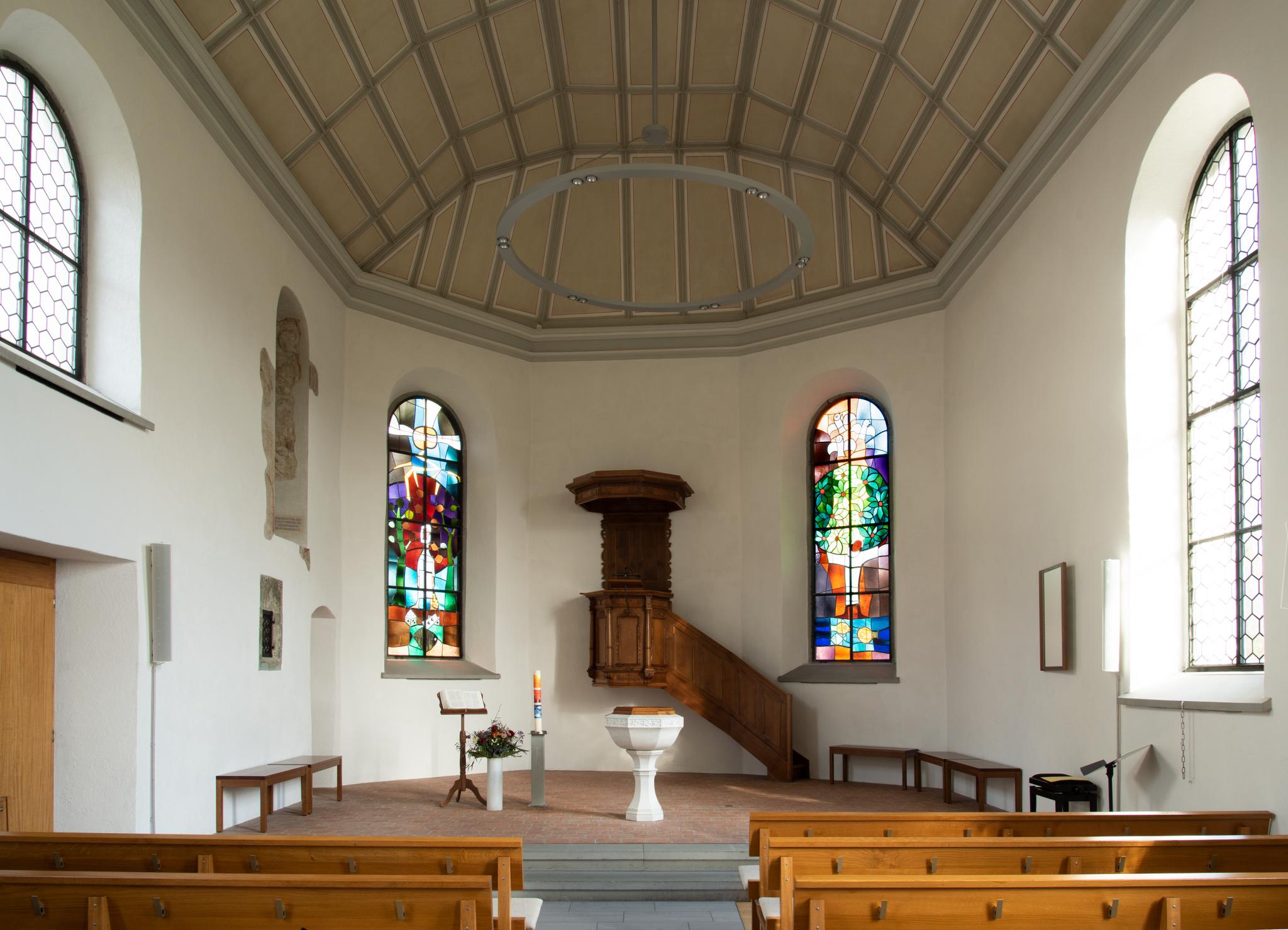 Ehemals freistehende Schlosskapelle südlich der Burg, Umbau und Vergrösserung 1684–85, Renovation und Bau des Turmes 1864–65. Restaurierung 1970-71. Farbfenster "Apokalypse" und "Heile Welt" von Hans Affeltranger, 1972.