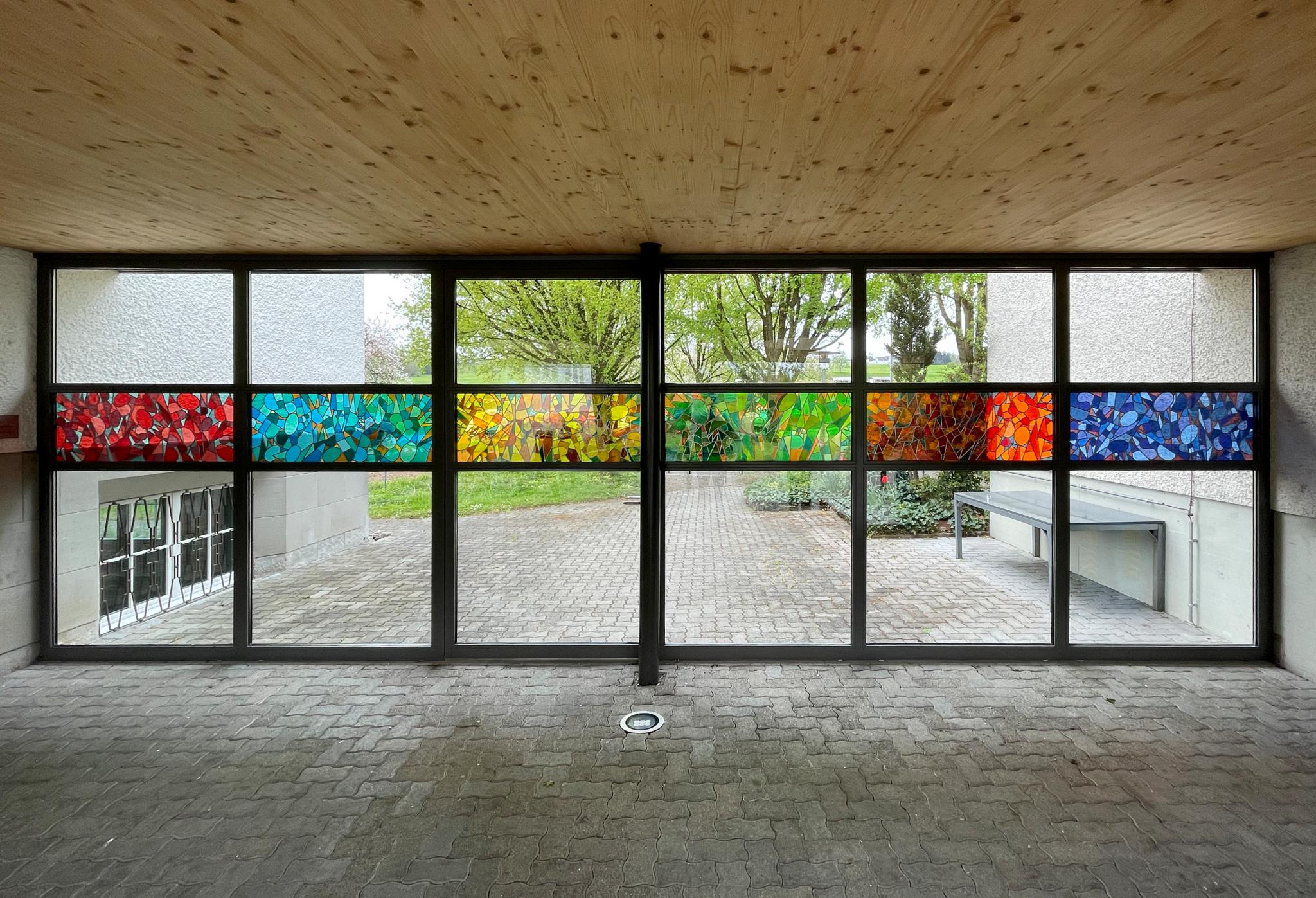 Schulanlage mit Schulhaus von 1911 (Büeler & Gilg) und Schulhauserweiterungsbauten 1988 (Candio und Müller, Amriswil). Im Windfang des überdeckten Ganges zwischen altem und neuem Schulgebäude Glasmalereien von Daniel Hebeisen, 2016 (Projekt Glasgestaltung mit den SchülerInnen der 1.–6. Klasse, 2016/17).