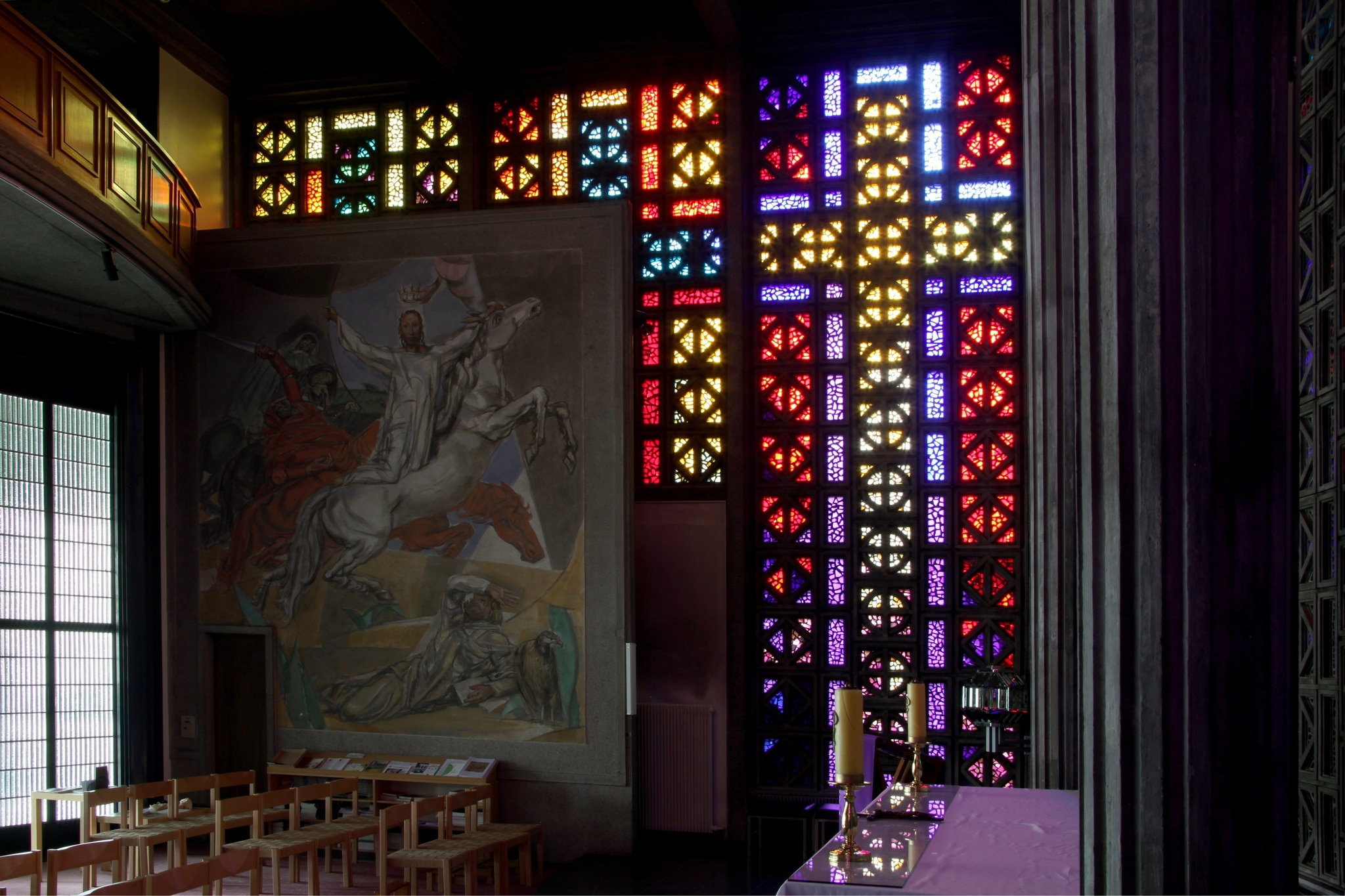 Lors de l'inauguration de l'Université en 1941, la chapelle n'a toutefois pas encore reçu ses vitraux (Termier, 1941, p. 33), dont la réalisation sera confiée à l'artiste Alexandre Cingria. Ce dernier optera pour une technique encore nouvelle en Suisse, la dalle de verre, dont l'utilisation permet d'obtenir une intégration encore plus forte que le vitrail au plomb dans l'architecture (Noverraz, Sauterel, Wolf, 2021, p. 50-59 ; Meer, 2002). Inaugurée le 4 mai 1944, la chapelle est également dotée d'oeuvres de l'orfèvre Marcel Feuillat qui conçoit le tabernacle en cristal de roche, et, un peu plus tard, les pieds sculptés de l'autel représentant les symboles des Évangélistes, auxquels s'ajouteront des anges sculptés de l'artiste fribourgeois Antoine Claraz (Feuillat, 1947, p. 67-69). Le peintre Maurice Barraud crée également deux peintures murales sur les panneaux latéraux sur le thème des Visions de l'apocalypse (Roetheli, 1946/1947, p. 3-7). Enfin, en 1983, l'artiste fribourgeois Yoki complète cette décoration par la réalisation d'un vitrail abstrait posé dans la baie fermant le sommet de la voûte tronconique située au-dessus des orgues, en collaboration avec le maître-verrier Michel Eltschinger.