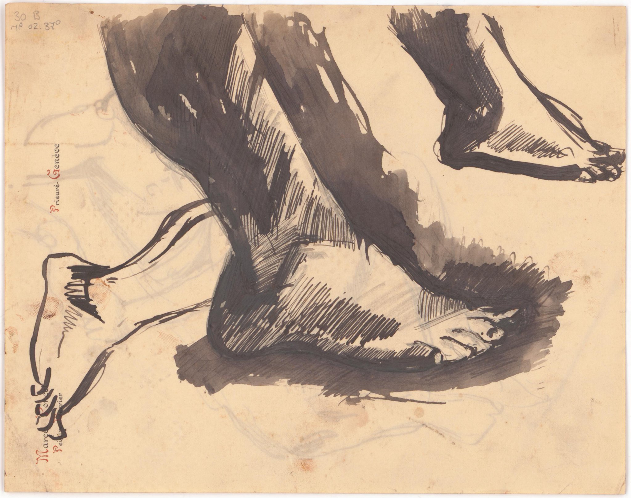 Deux études du pied du saint Jean ou saint Luc couché au verso d'une esquisse avec saint Jean ou saint Luc couché pour le vitrail des quatre Evangélistes de la cathédrale de Lausanne